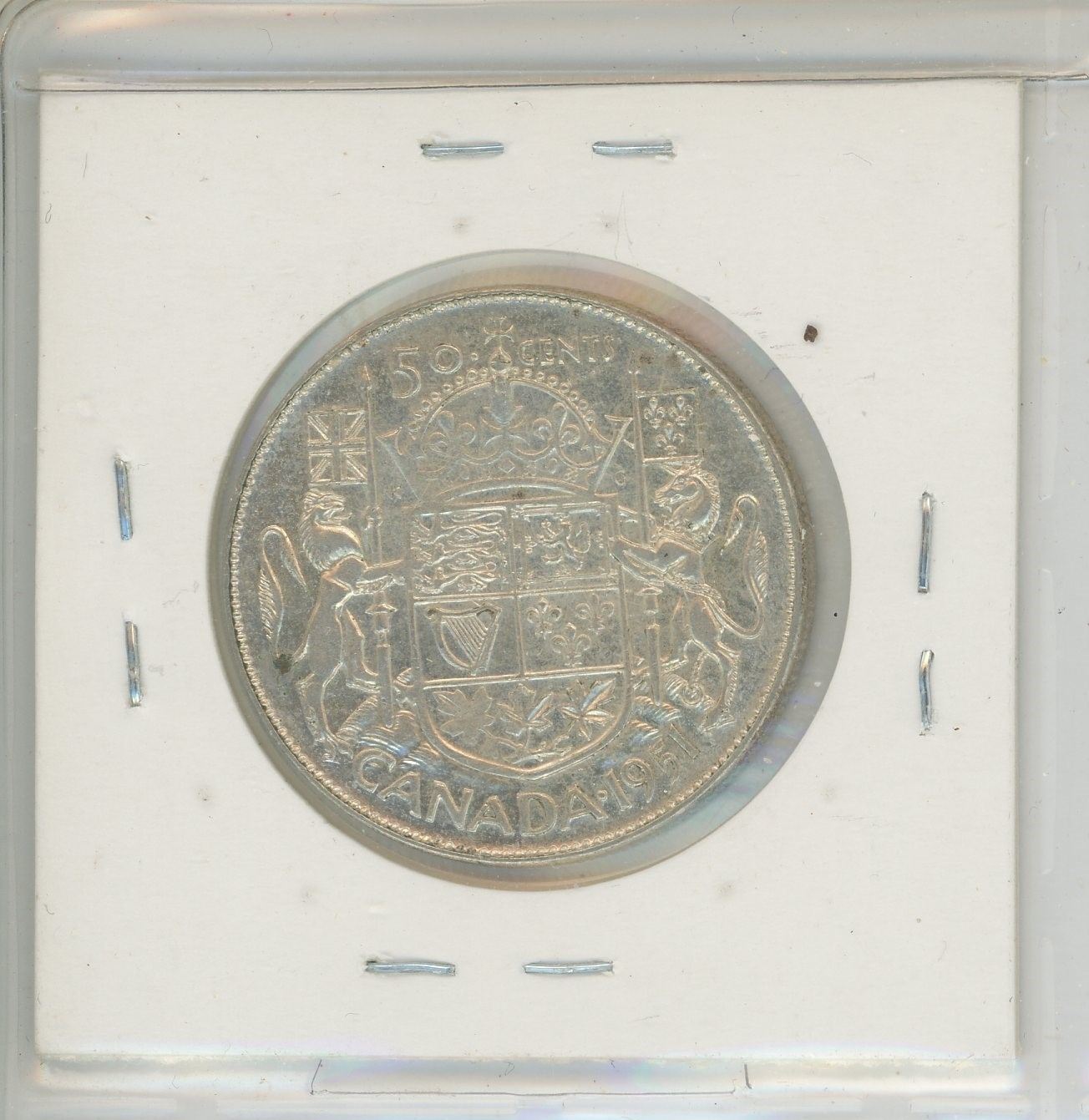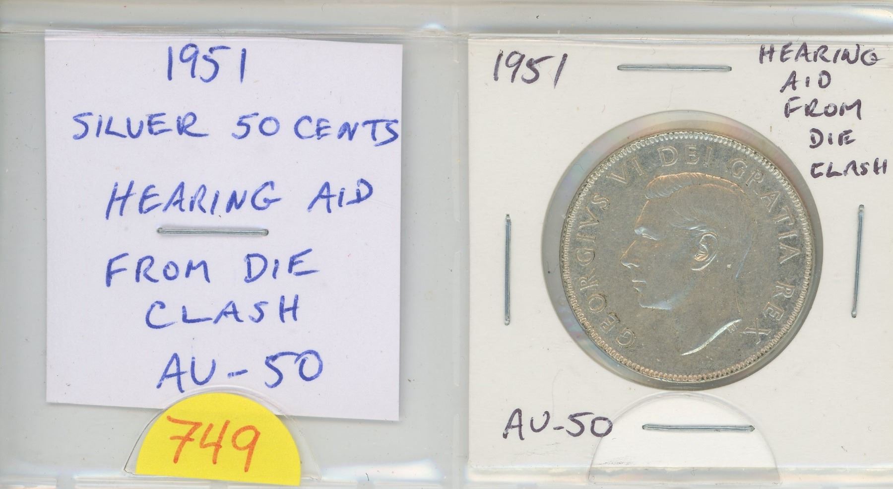 1951 silver 50 cents with Hearing Aid in the king’s ear from a Die Clash AU-50.
