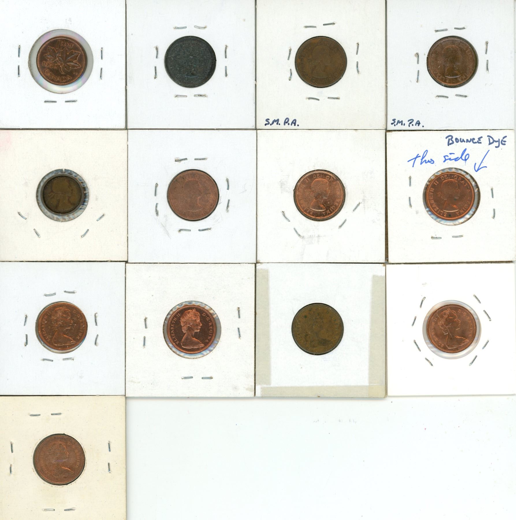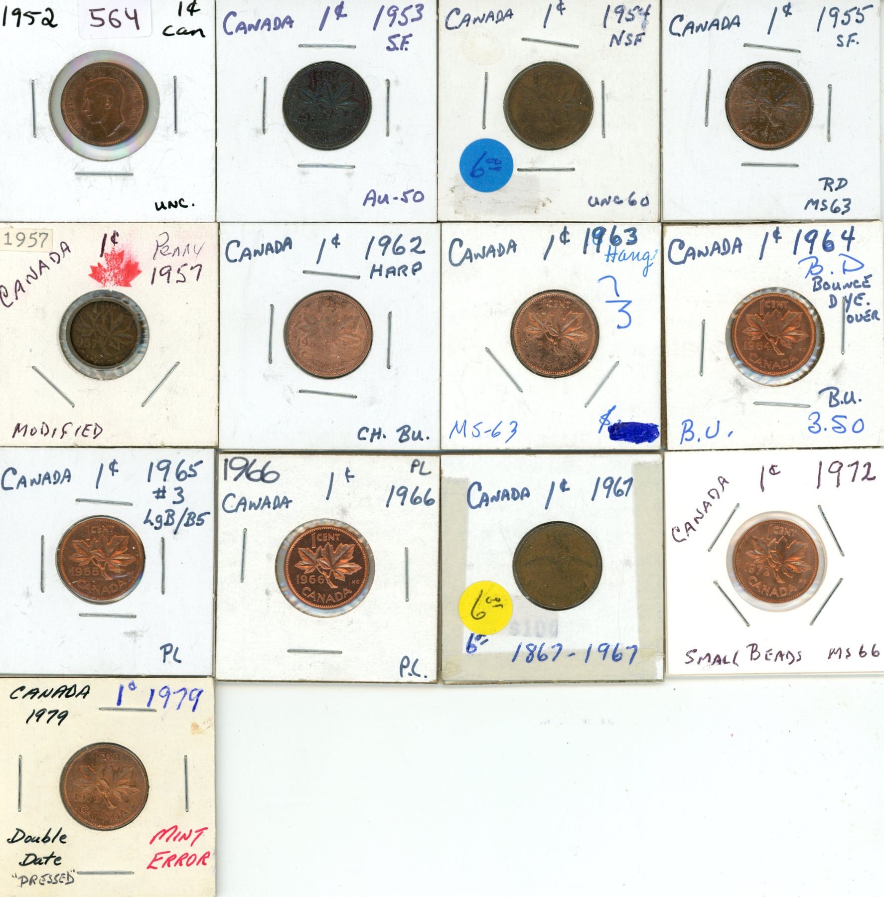 1952-1955, 1957, 1962-1967, 1972 (Small Bead) Canadian One Cents.