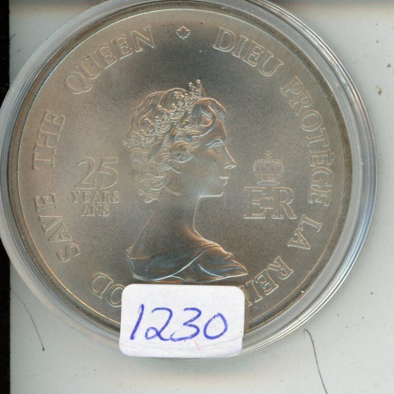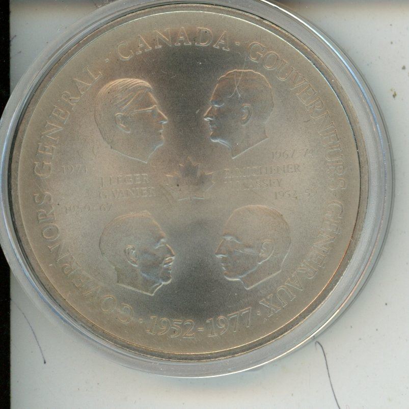 1952 – 1977 Queen Elizabeth 25th Anniversary Silver Jubilee Medal that also celebrates the Governors General of Canada that served during her reign: Massey, Vanier, Leger & Michener. Housed in a hard plastic holder.