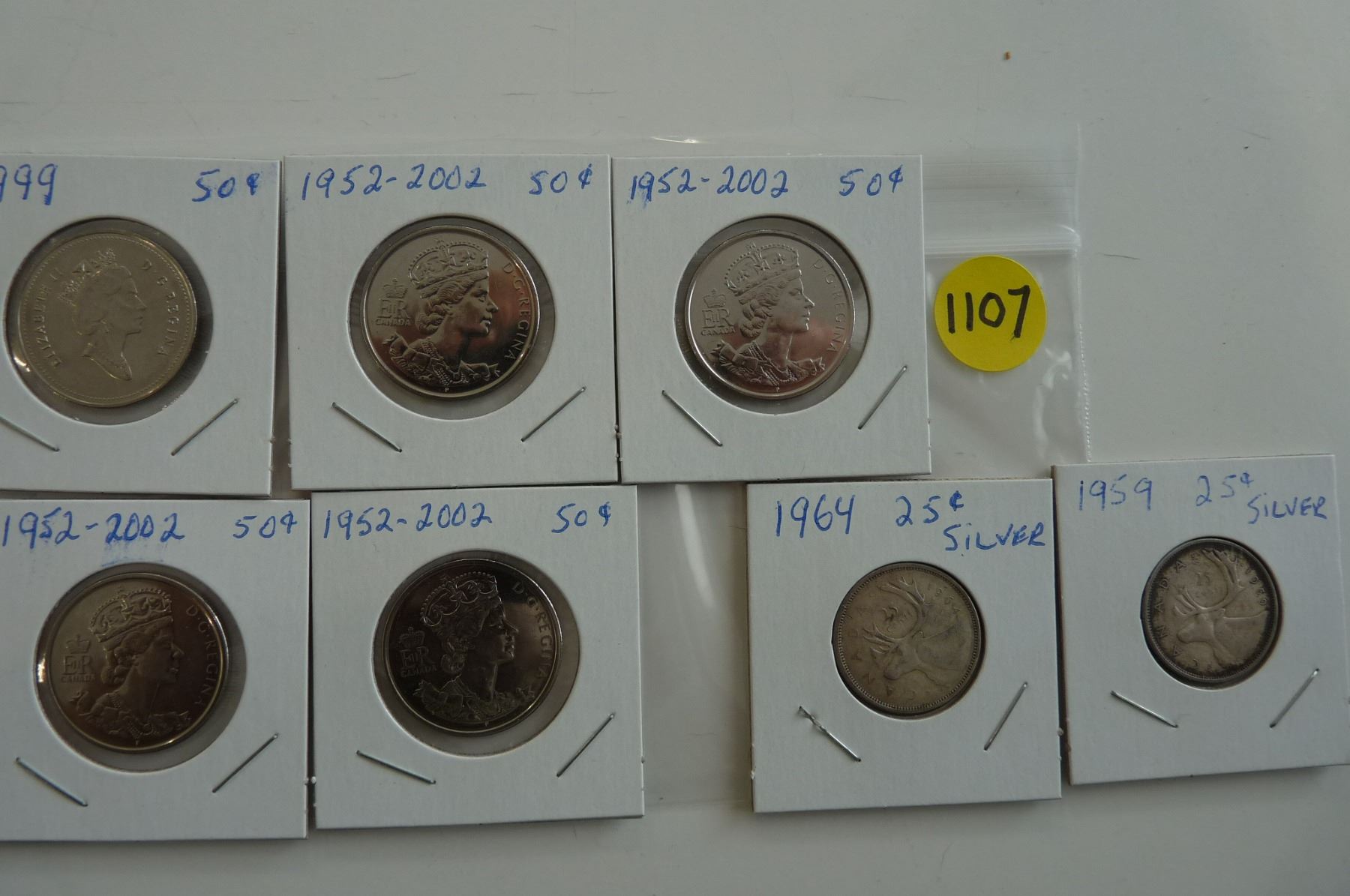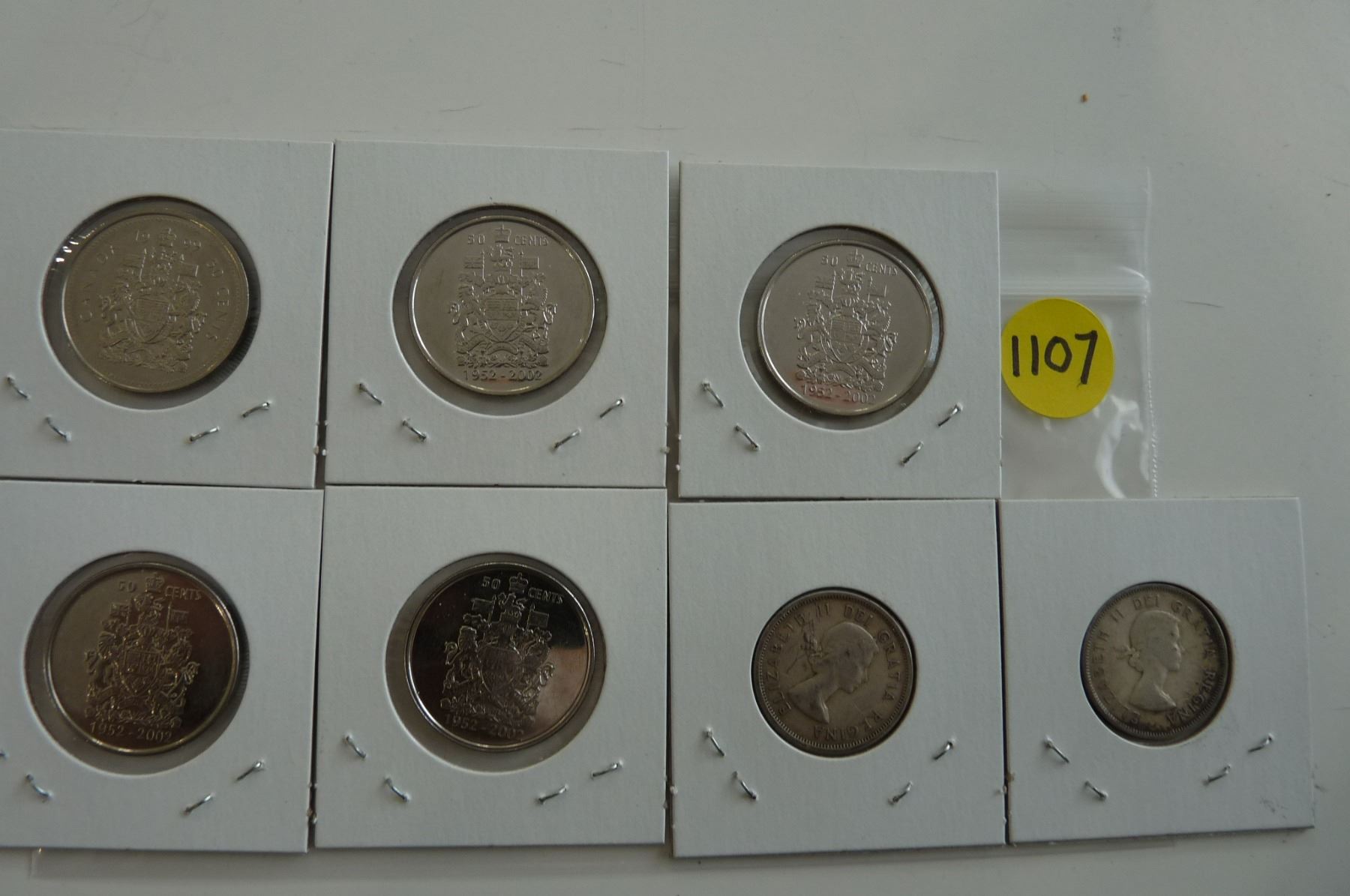 1952-2002 Fifty Cent coins (x4), 1999 - Fifty cent coin, 1959 & 1964 Silver 25 cent coins