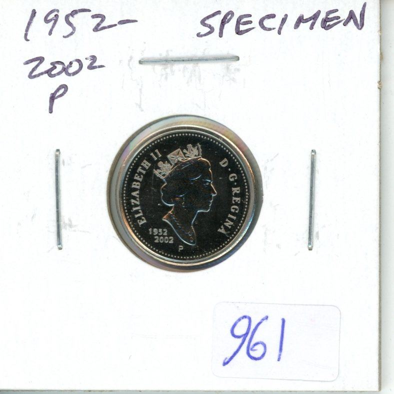1952 – 2002P Specimen 10 Cents. 50th Anniversary of Queen Elizabeth. The special finish on the coin is a three-fold combination of brilliant and frosted relief on a lined finish background.