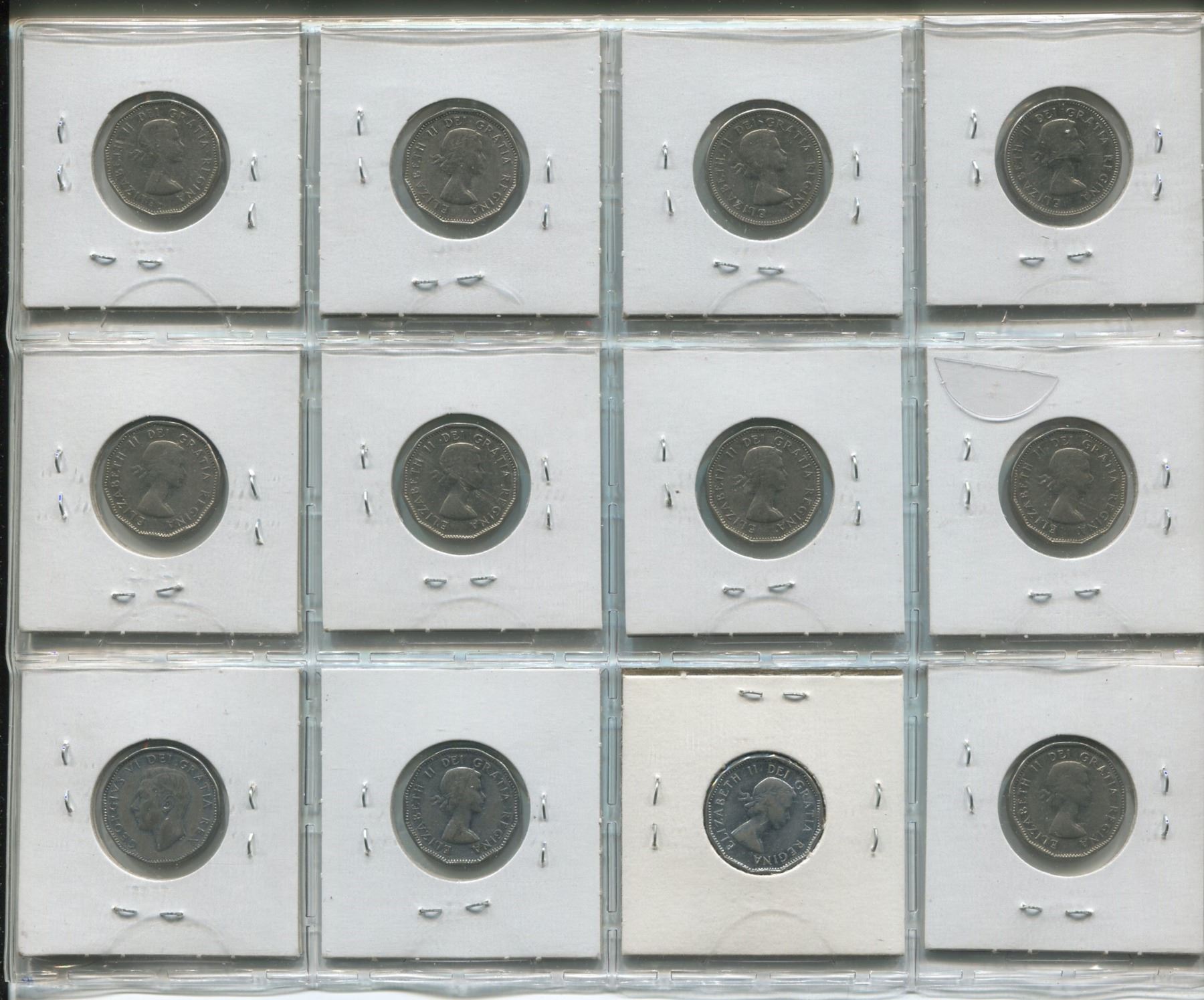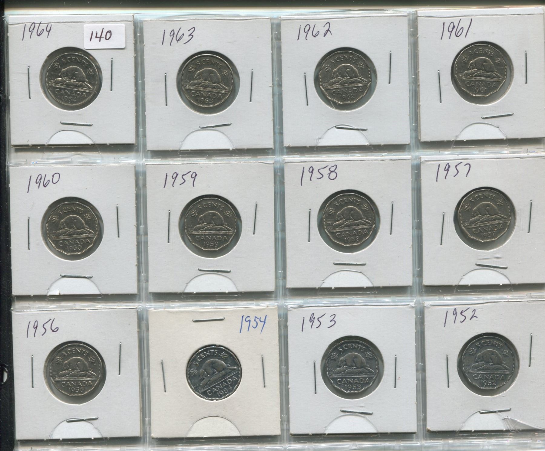1952,53,54,56,57,58,59,60,61,62,63 64 Beaver,12-Canadian 5 cent coins,King George VI and Queen Elizabeth II