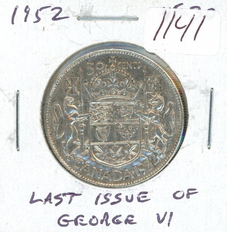 1952 Canadian Silver 50 Cents. Last 50 Cents issued for King George VI. VF-30.