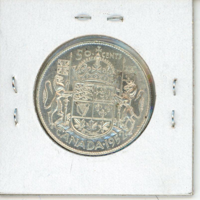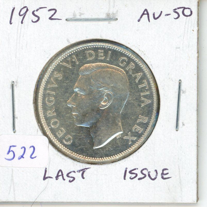 1952 Canadian Silver 50 Cents. Last issue of King George VI. AU-50.