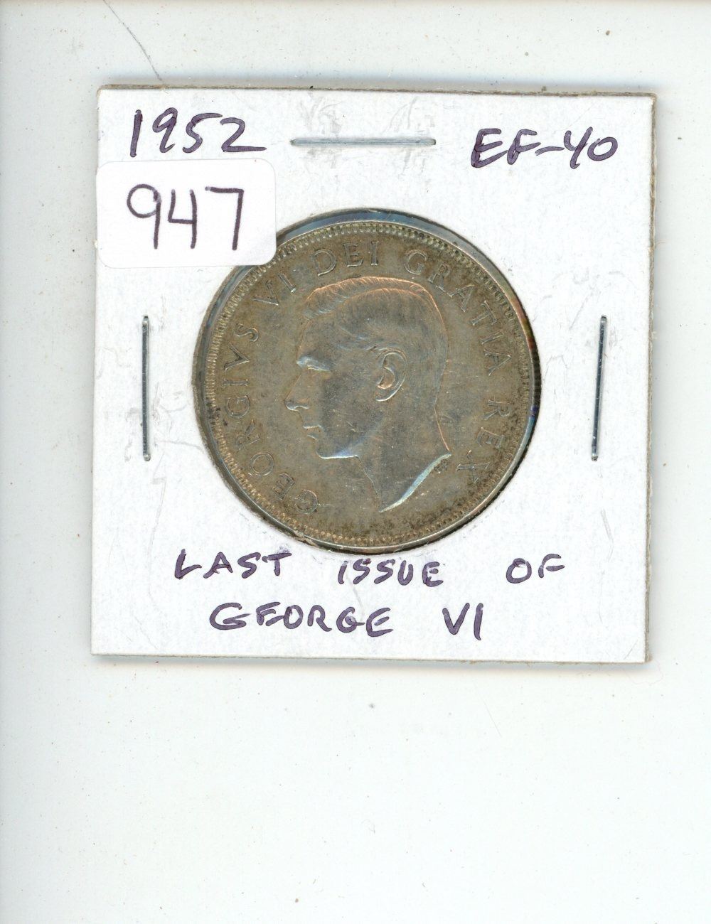 1952 George VI Silver 50 Cents. Last 50 Cents issued for King George VI. EF-40. Nice.