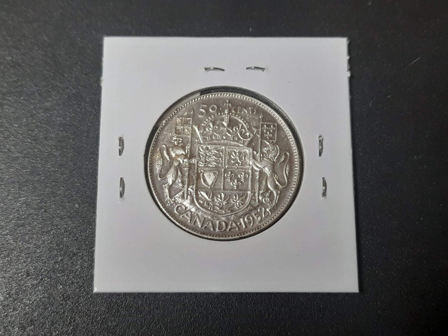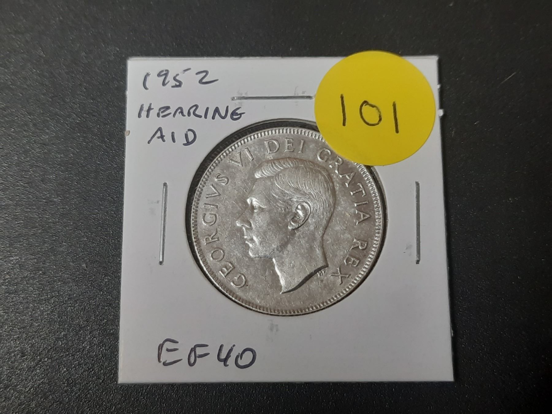 1952 Hearing Aid Canadian Silver 50 Cents. The Hearing Aid in the king’s ear is the result of a Die Clash. EF. Scarce.