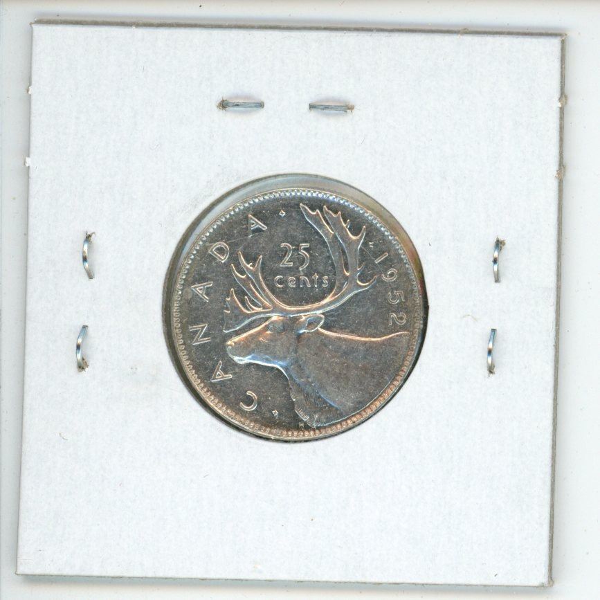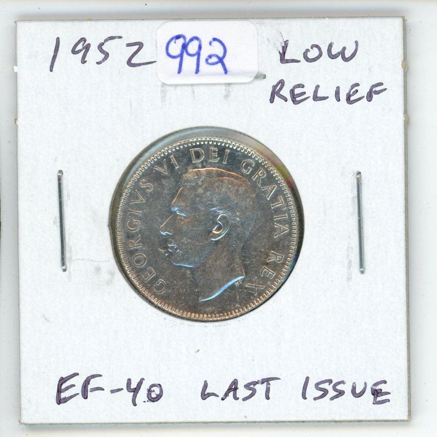 1952 Low Relief Canadian Silver 25 Cents. Last issue of George VI. EF-40.