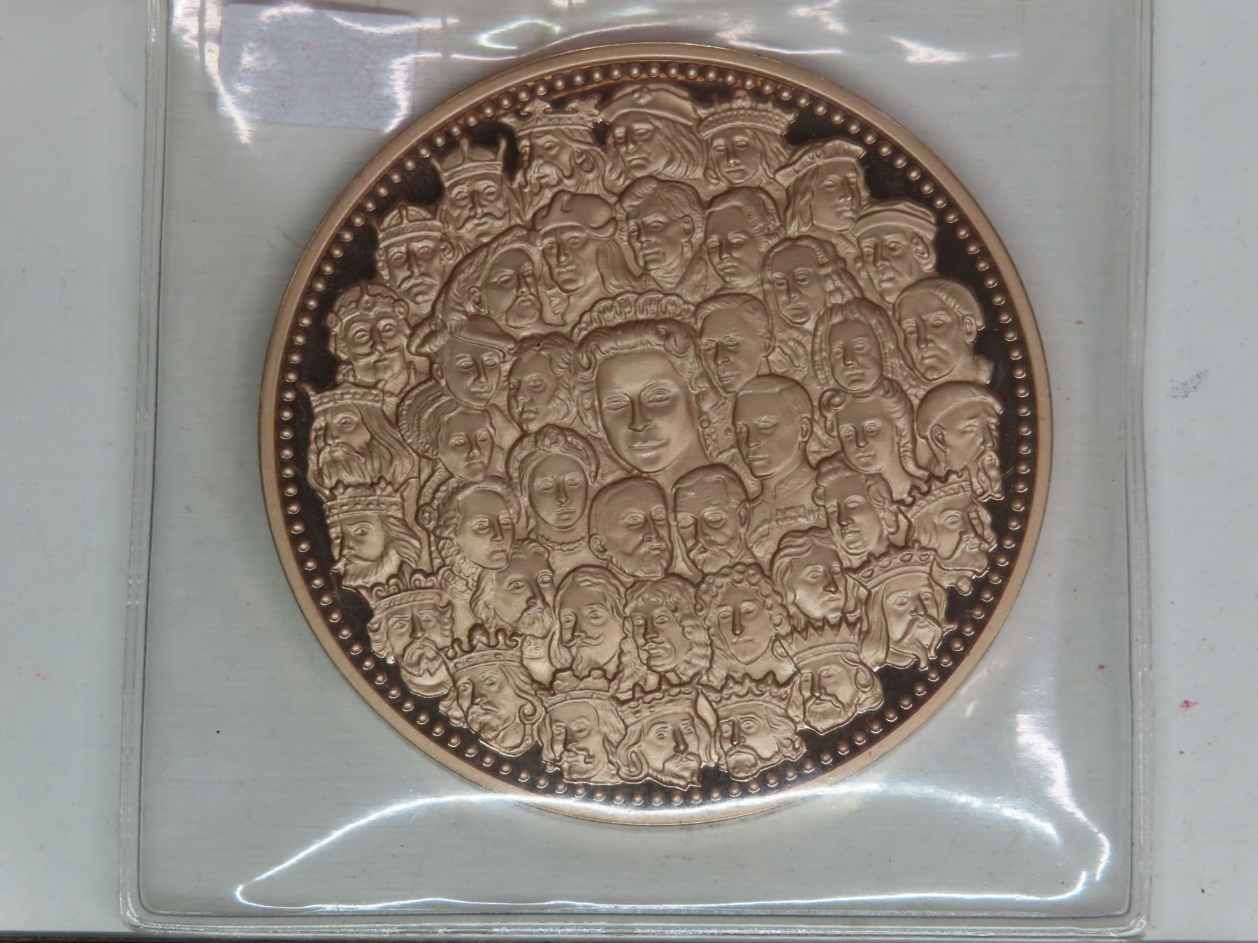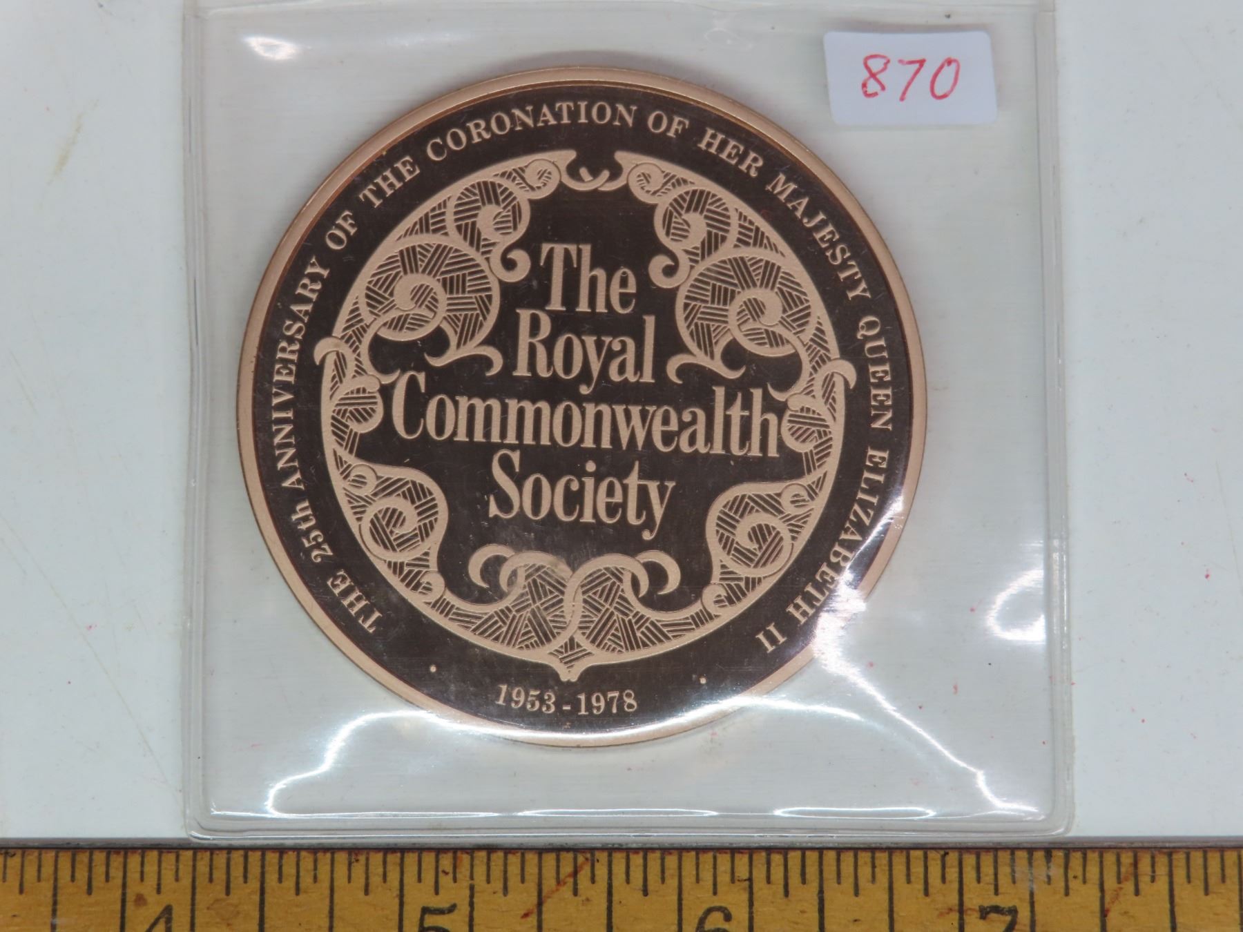 1953 – 1978 25th Anniversary of the Coronation of Her Majesty Queen Elizabeth II bronze medal. Massive 2 ½” medal depicts all the kings & queens of England. Serial Number 0873 on edge. Issued by the Royal Commonwealth Society.