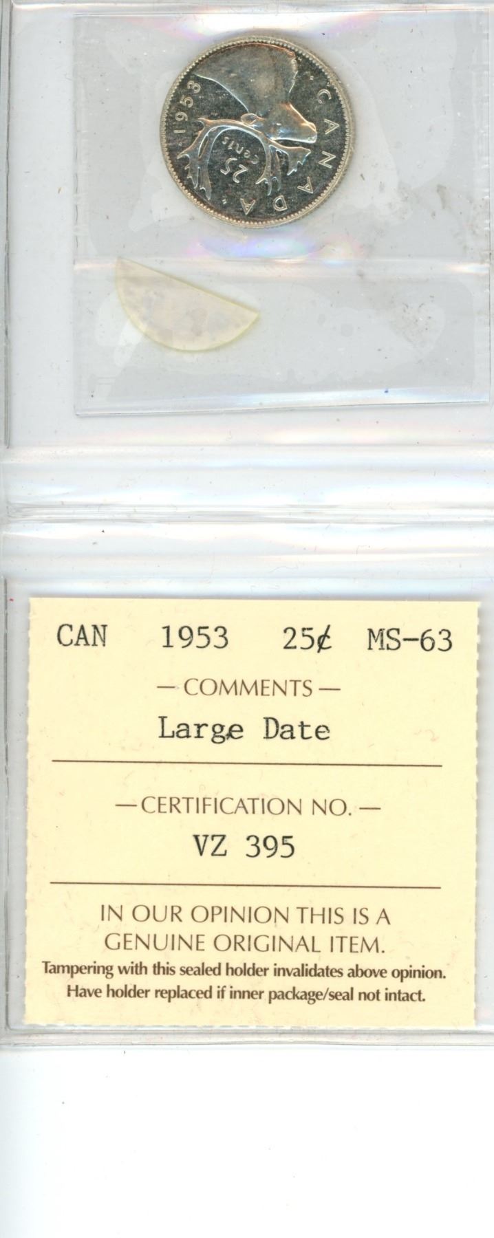 1953 Large Date Canadian Silver 25 Cents. ICCS graded and certified MS-63 Large Date.