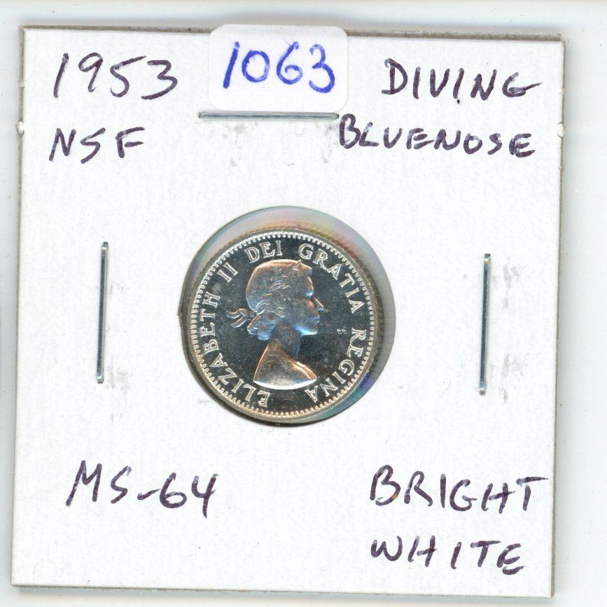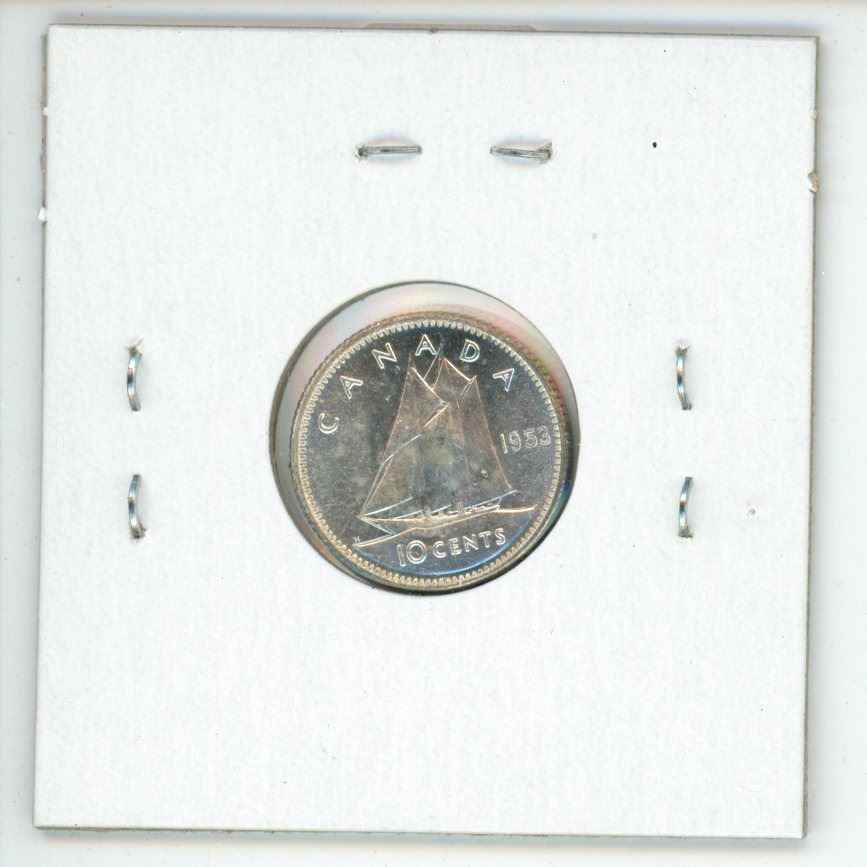 1953 No Shoulder Fold Diving Bluenose Canadian Silver 10 Cents. MS-64. Bright White.