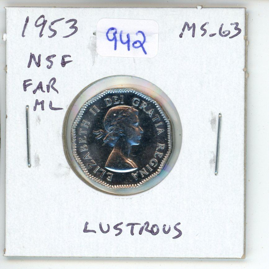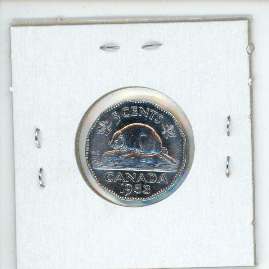 1953 No Shoulder Fold, Far Maple Leaf Canadian 5 Cents. MS-63. Lustrous.