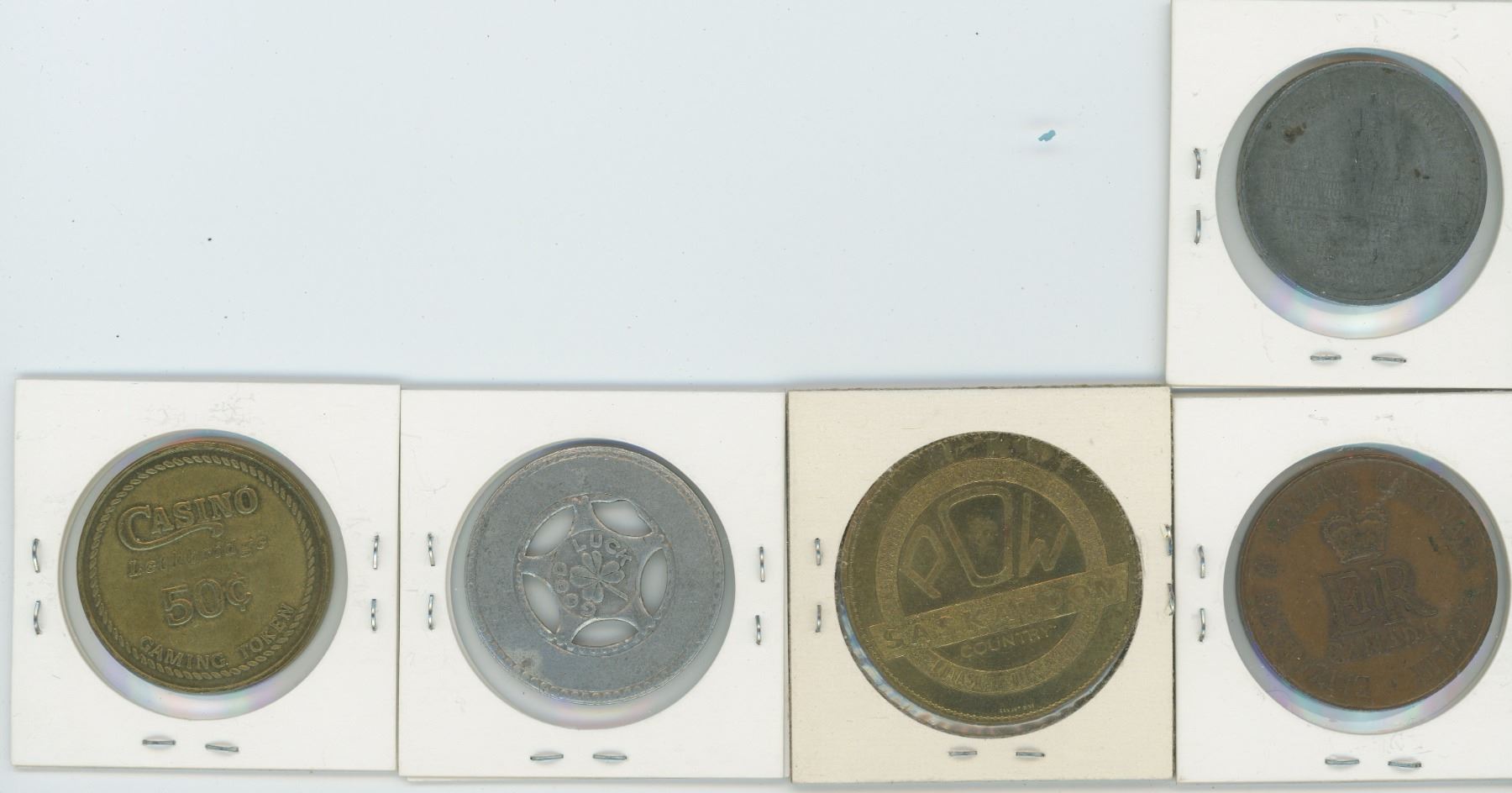 1953 QE II Coronation, 1960s Shell Oil Token, 2000 Casino Lethbridge, Bette Saumer Senlac, SK, 1969 Saskatoon Trade Buck