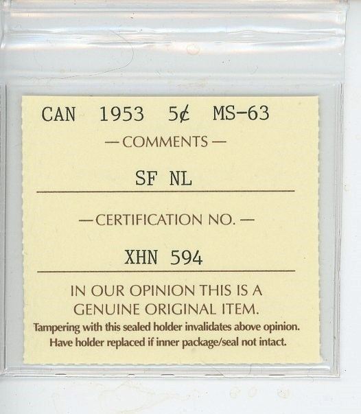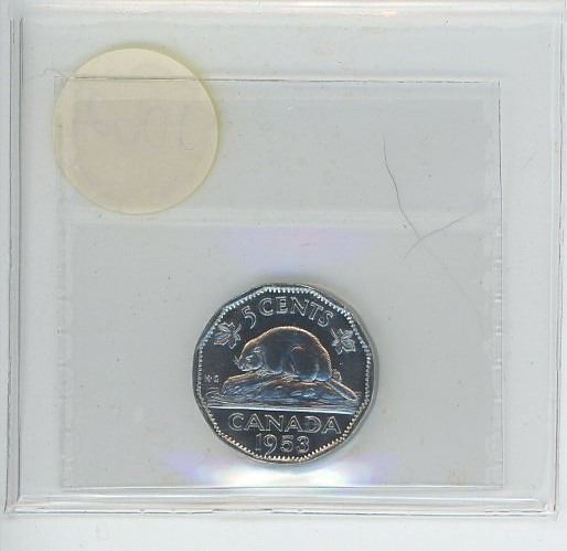 1953 SF NL ICCS GRADED CANADIAN FIVE CENT COIN - MS63