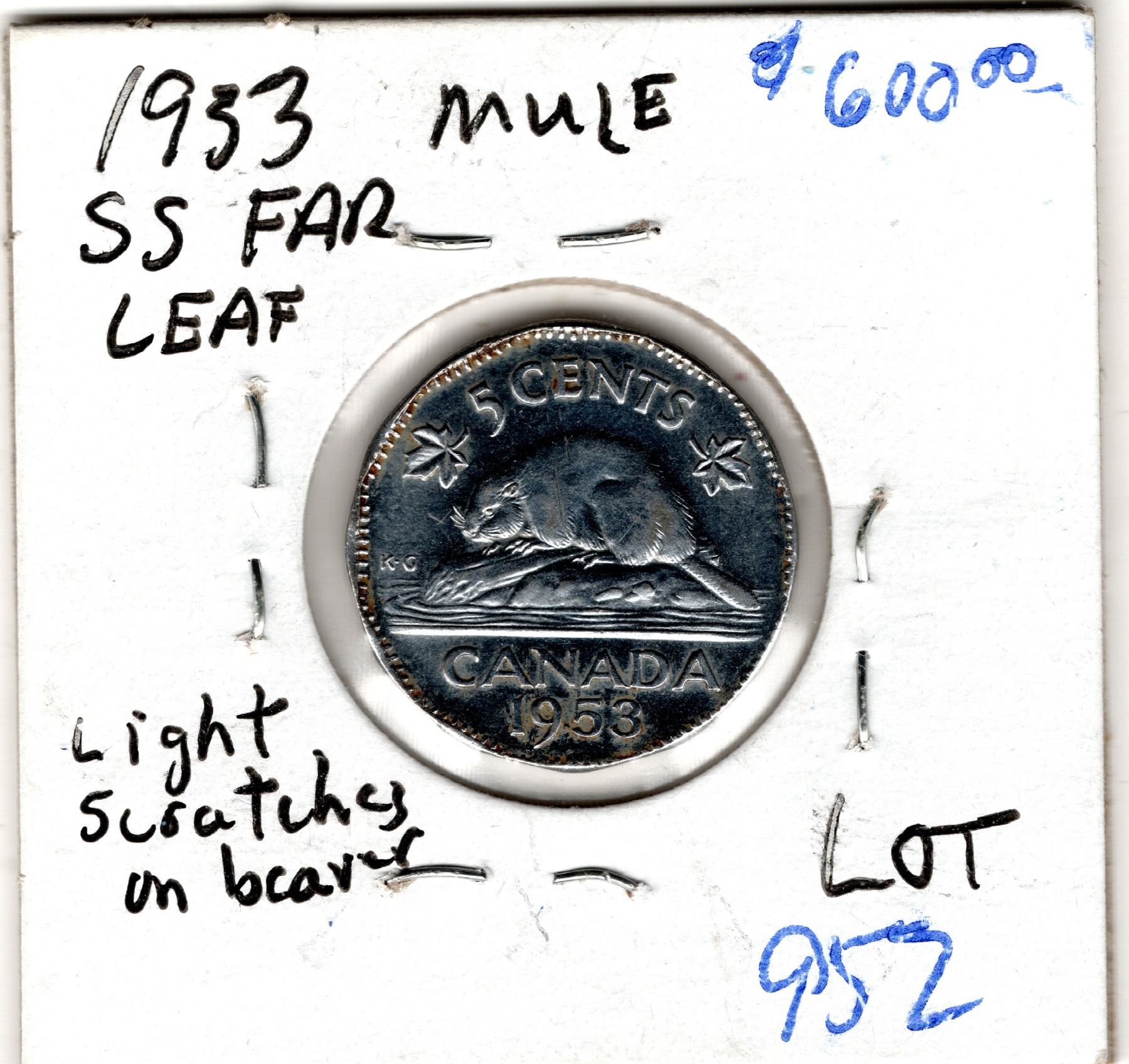 1953 SS FAR LEAF MULE FIVE CENT, SCARCE