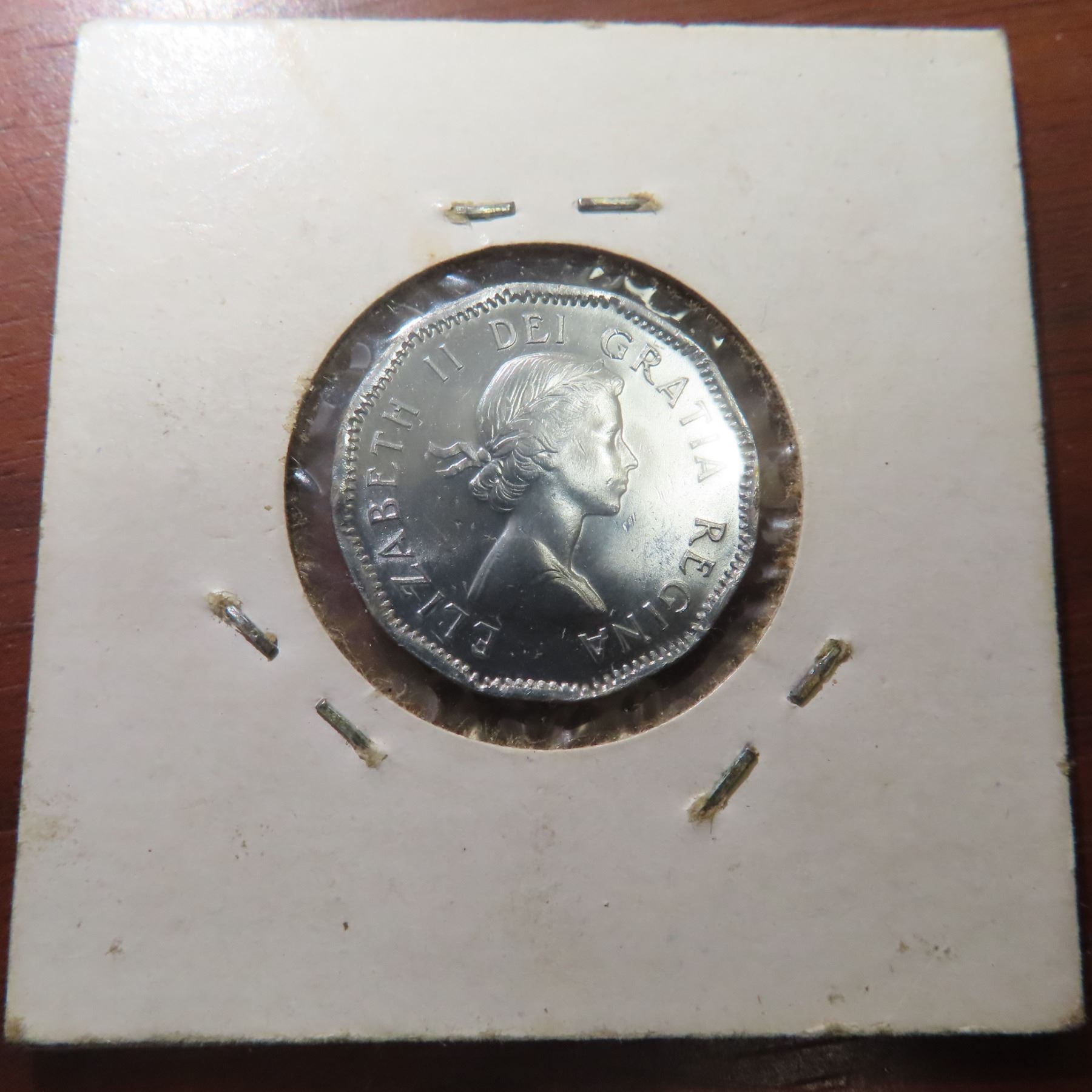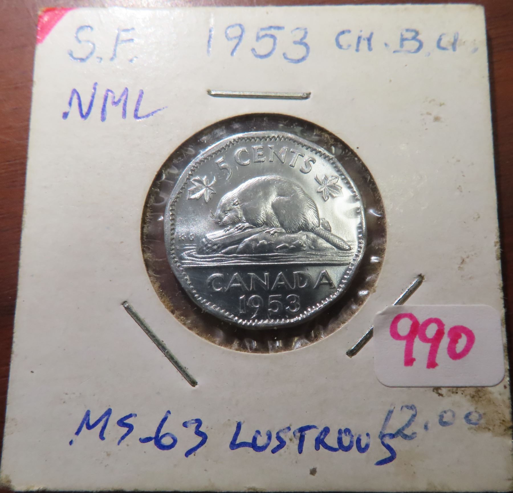 1953 Shoulder Fold, Near Maple Leaf 5 Cents. First year of Queen Elizabeth. MS-63. Lustrous.