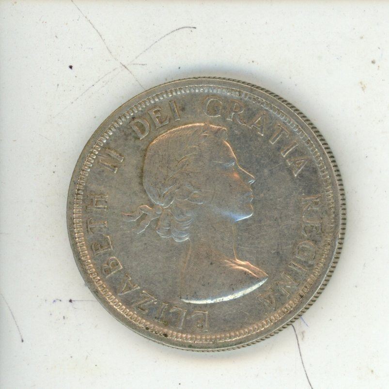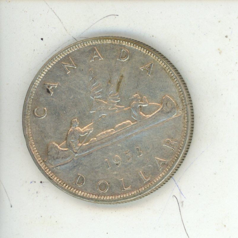 1953 -flat border, shoulder strap- Canadian silver dollar