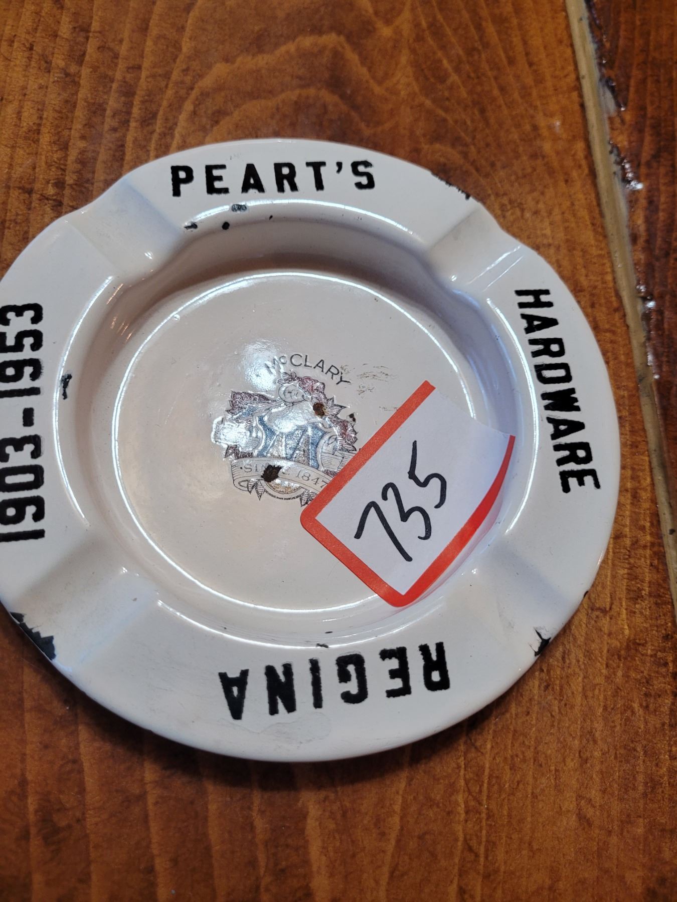 1953 porcelain Pearts Hardware Regina ashtray, McClary stove