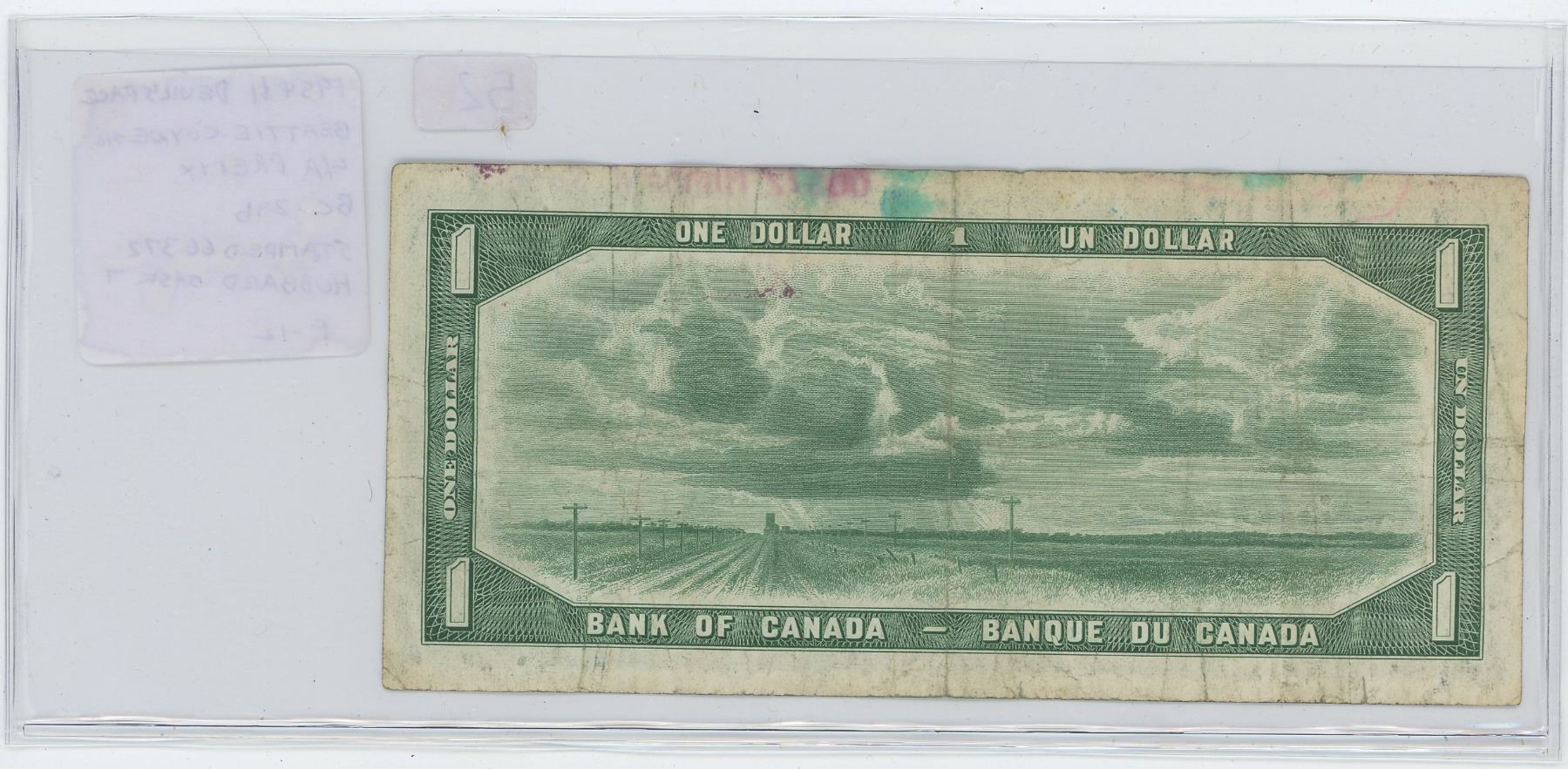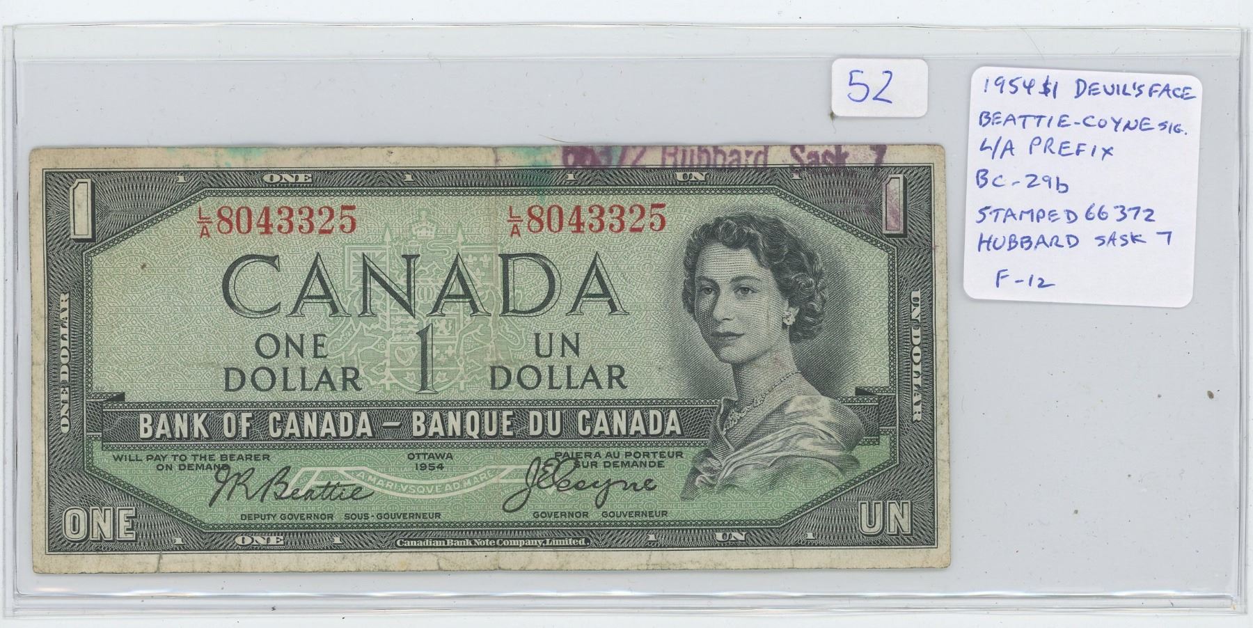 1954 $1 Devil’s Face $1 note. Beattie-Coyne signatures. L/A. Prefix. BC-29b. Ink Stamped 66372 Hubbard Sask 7 at top left. F-12.