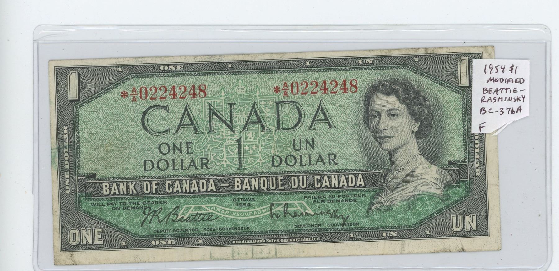 1954 $1 Modified Portrait Replacement Note. Beattie-Rasminsky signatures. *A/A prefix. BC-37bA. F-12.
