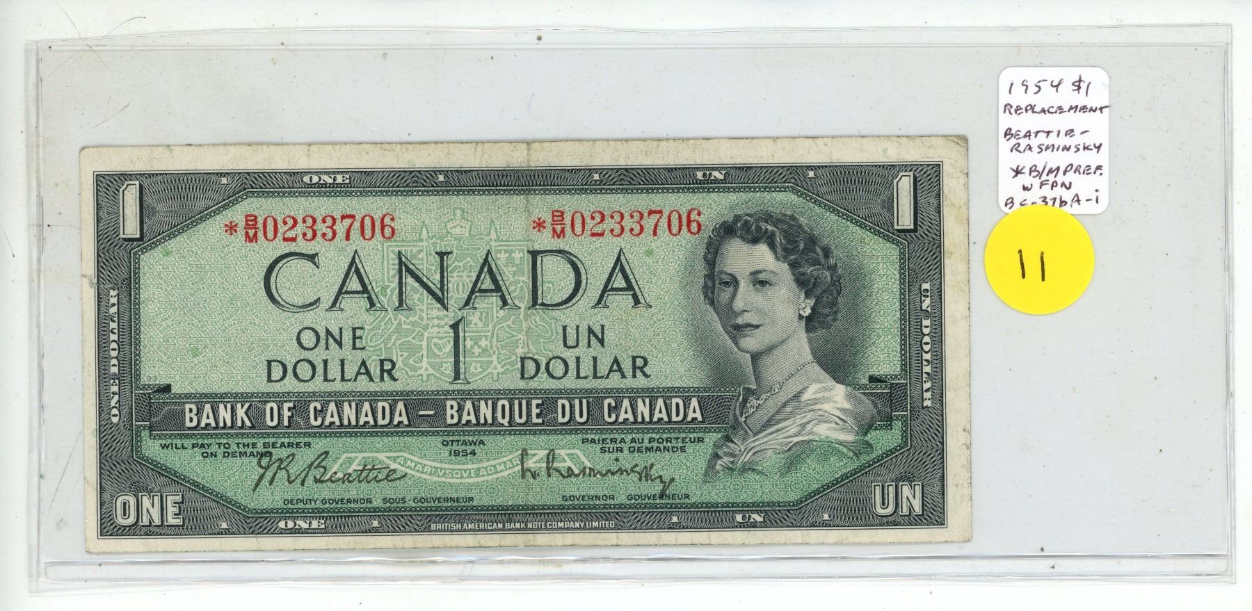 1954 $1 Modified Portrait Replacement note. Beattie-Rasminsky signatures. *B/M Replacement Prefix with Front Position Number. BC-37bA-i. Fine.