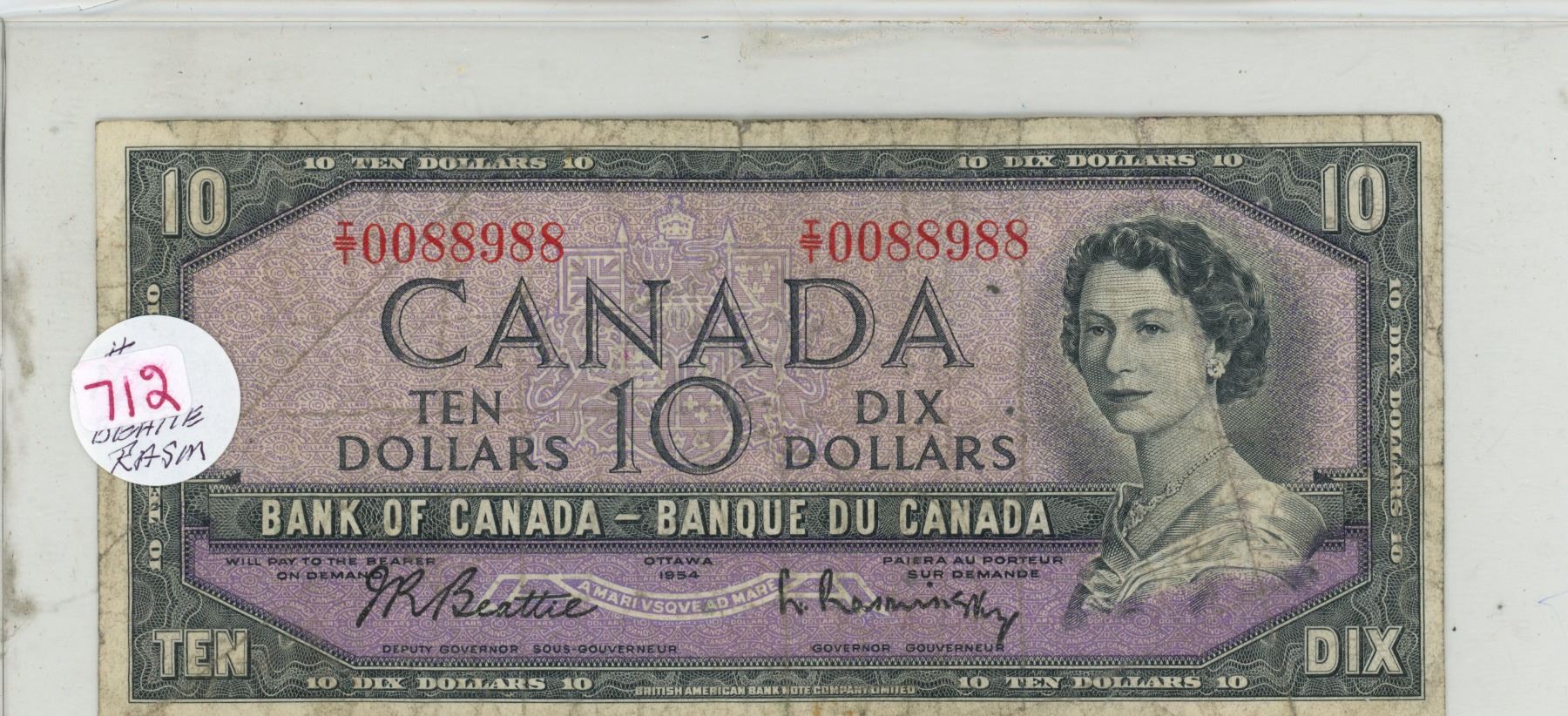 1954 $10 Canadian bill- Beattie/ Rasminksy