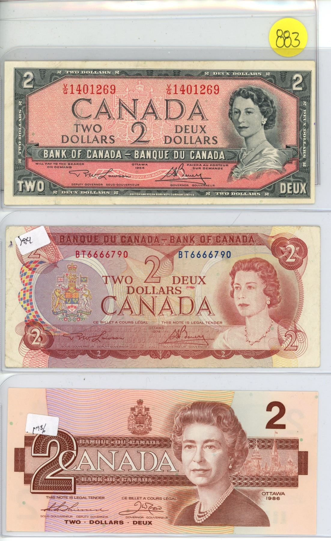1954, 1974, 1986 Canada $2.00 two dollar bills