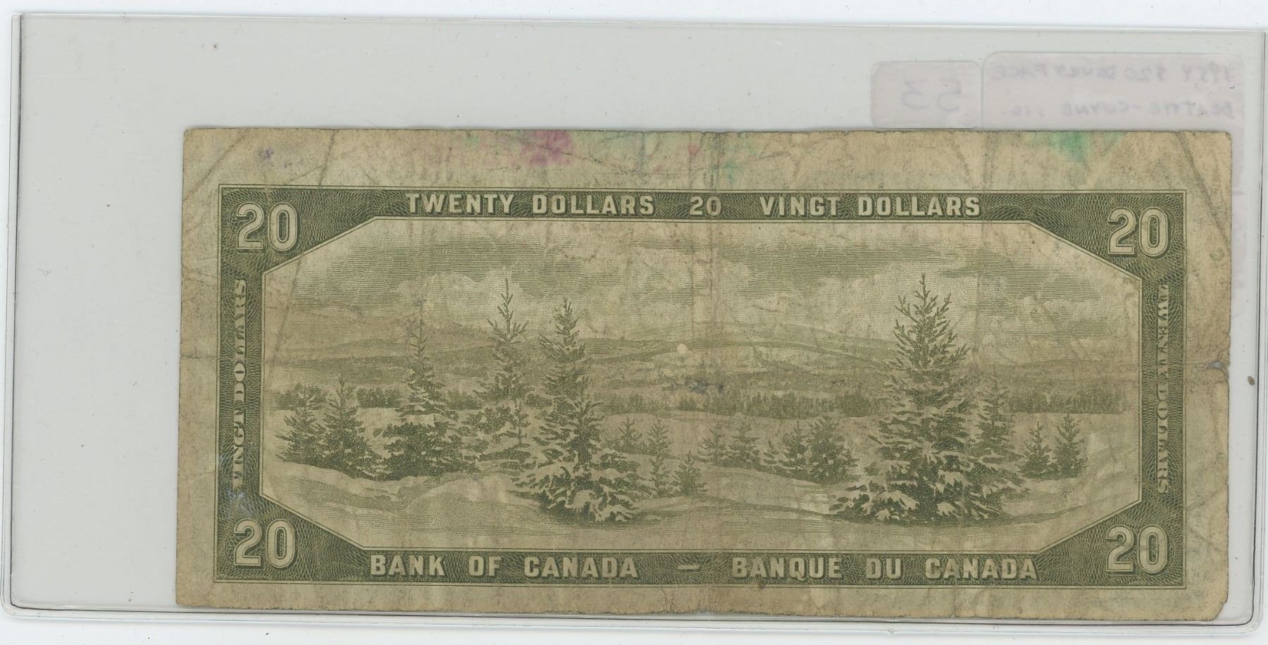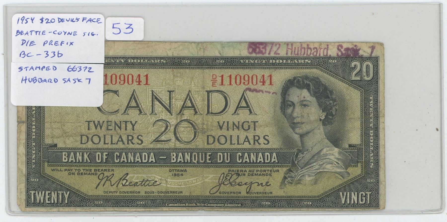 1954 $20 Devil’s Face $20 note. Beattie-Coyne signatures. D/E Prefix. BC-33b. Ink Stamped 66372 Hubbard Sask 7 at top left. VG-8.