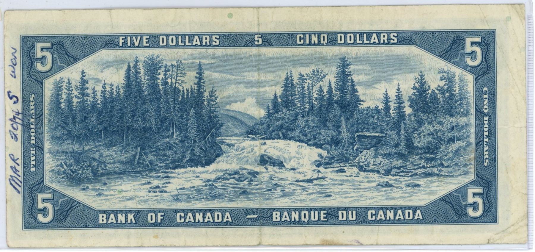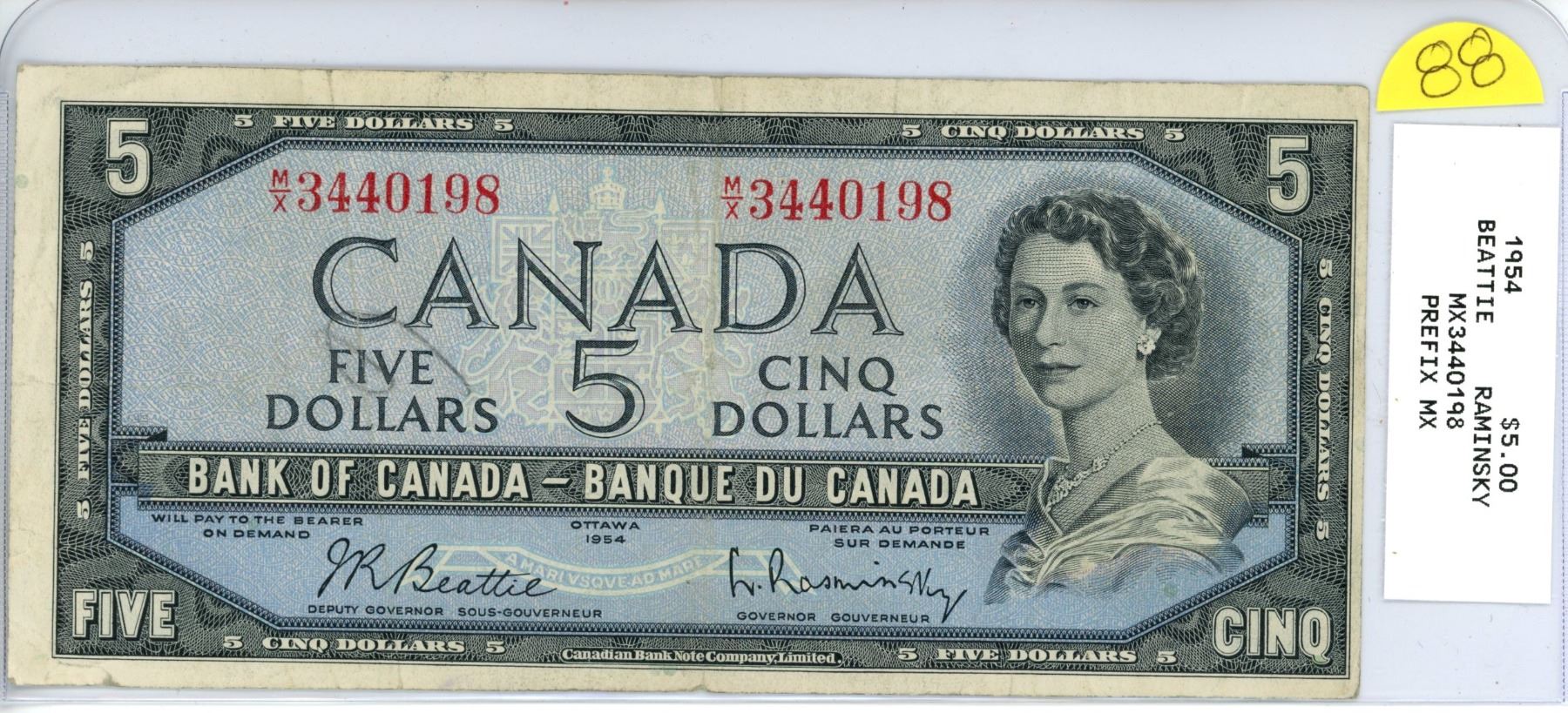 1954 $5.00 bill - M/X 3440198 Beattie Raminsky special prefix