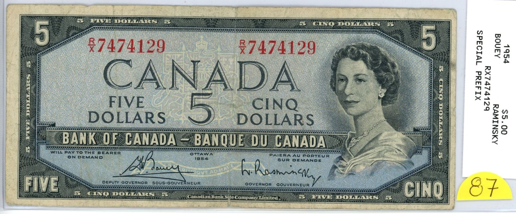 1954 $5.00 bill - R/X 7474129 Bouey Raminsky special prefix