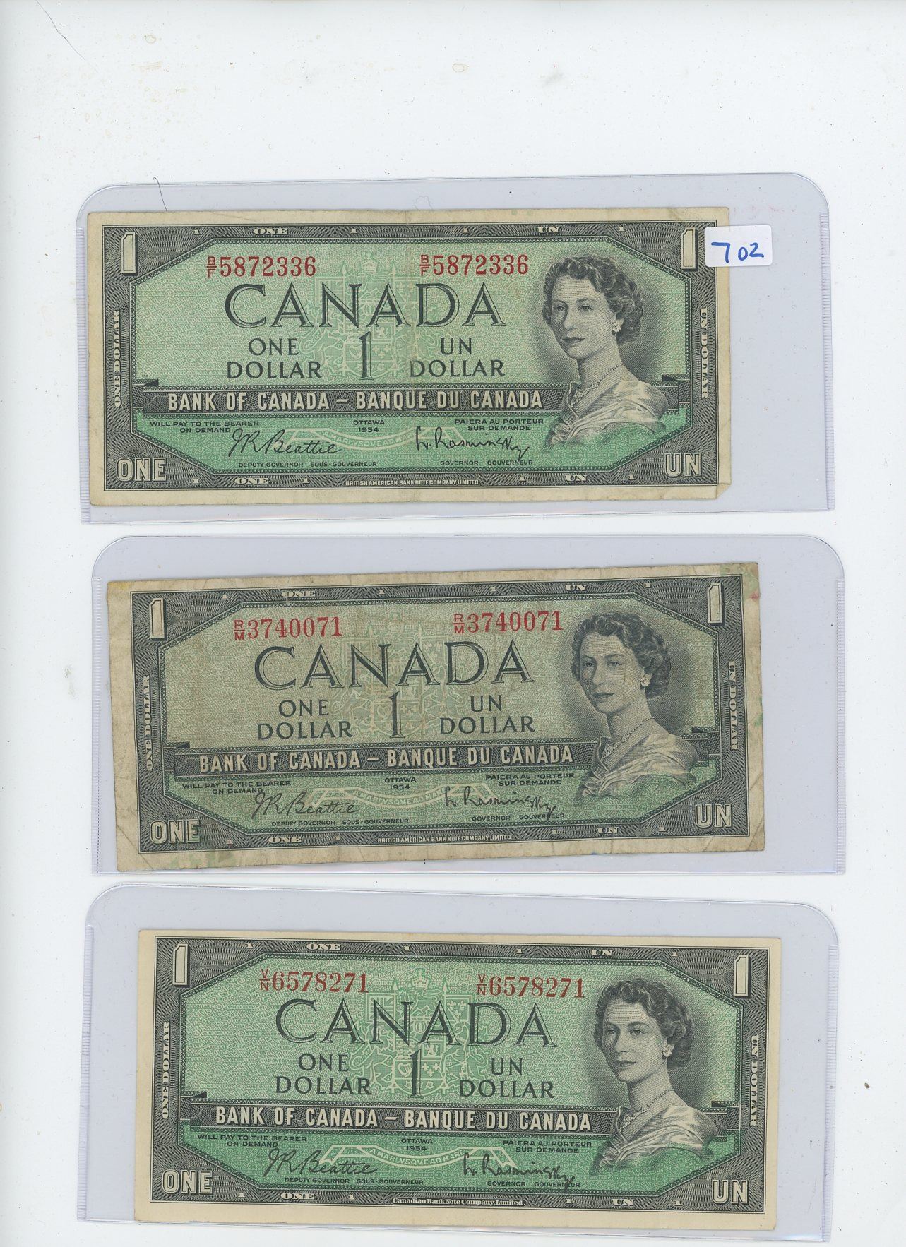 1954 Bank of Canada $1.00 Bill Sig. Beattie & Rasminsky x 3