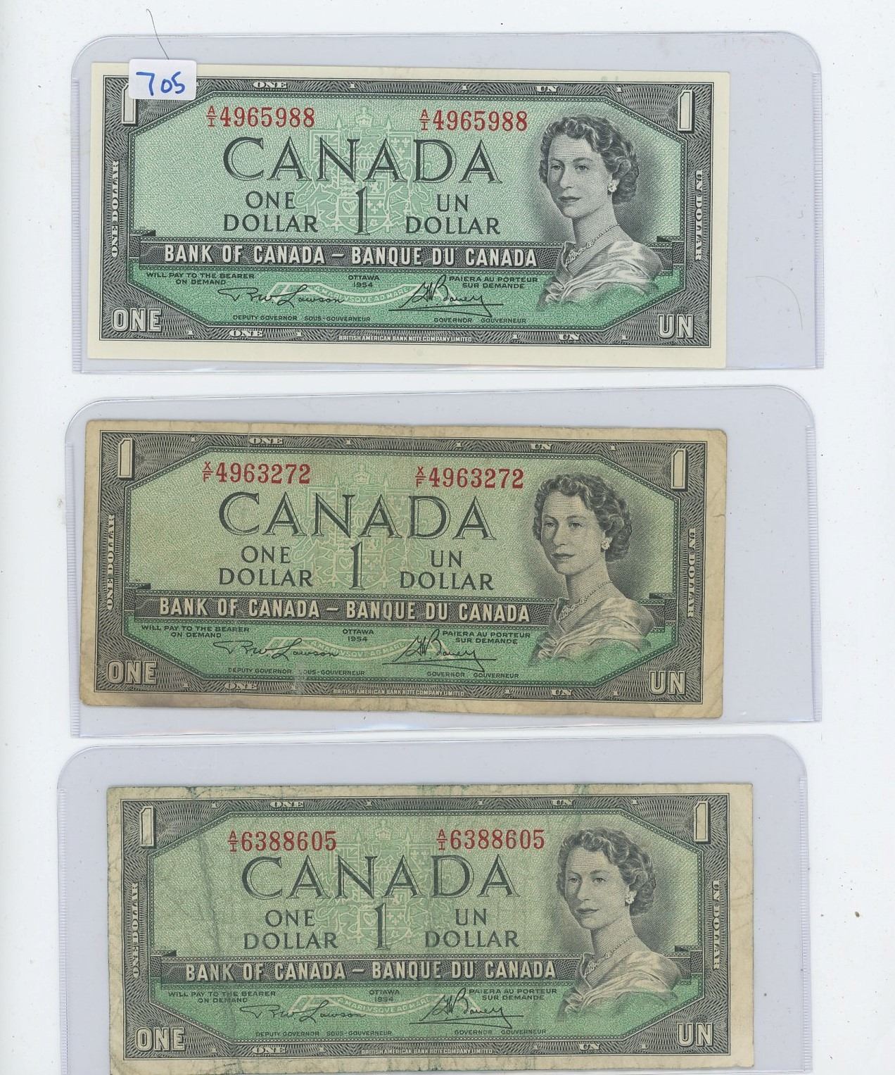 1954 Bank of Canada $1.00 Bill Sig. Lawson & Bouey x 3