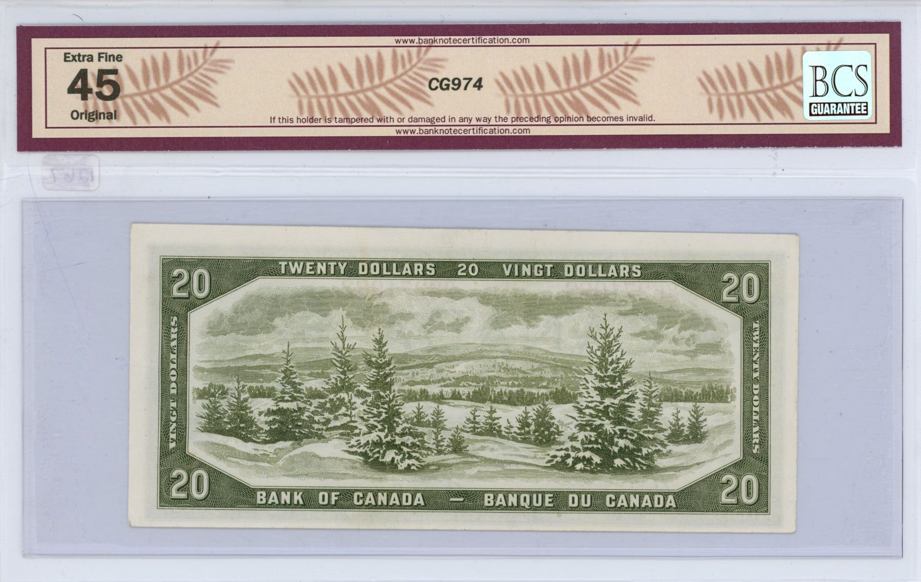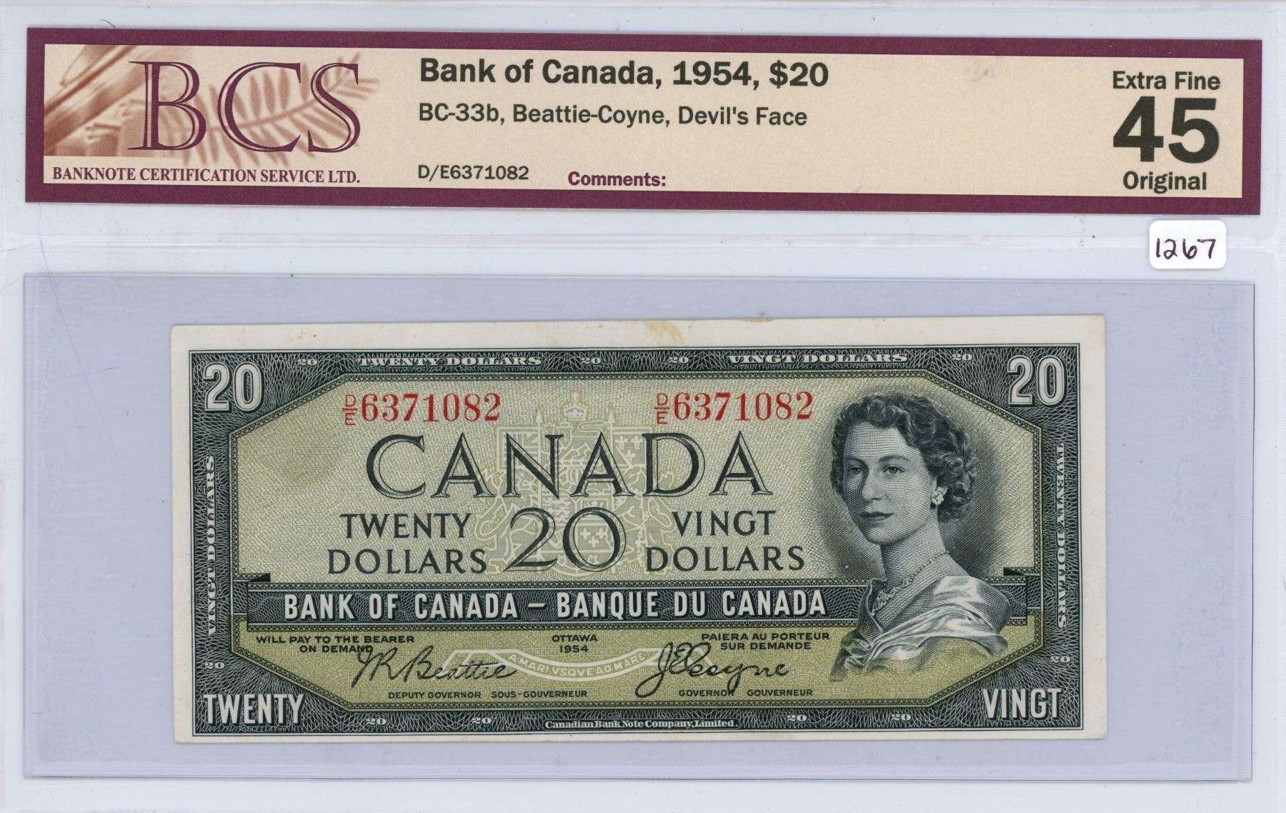1954 Bank of Canada twenty dollars Beattie/Coyne D/E6371082 BCS graded EF-45