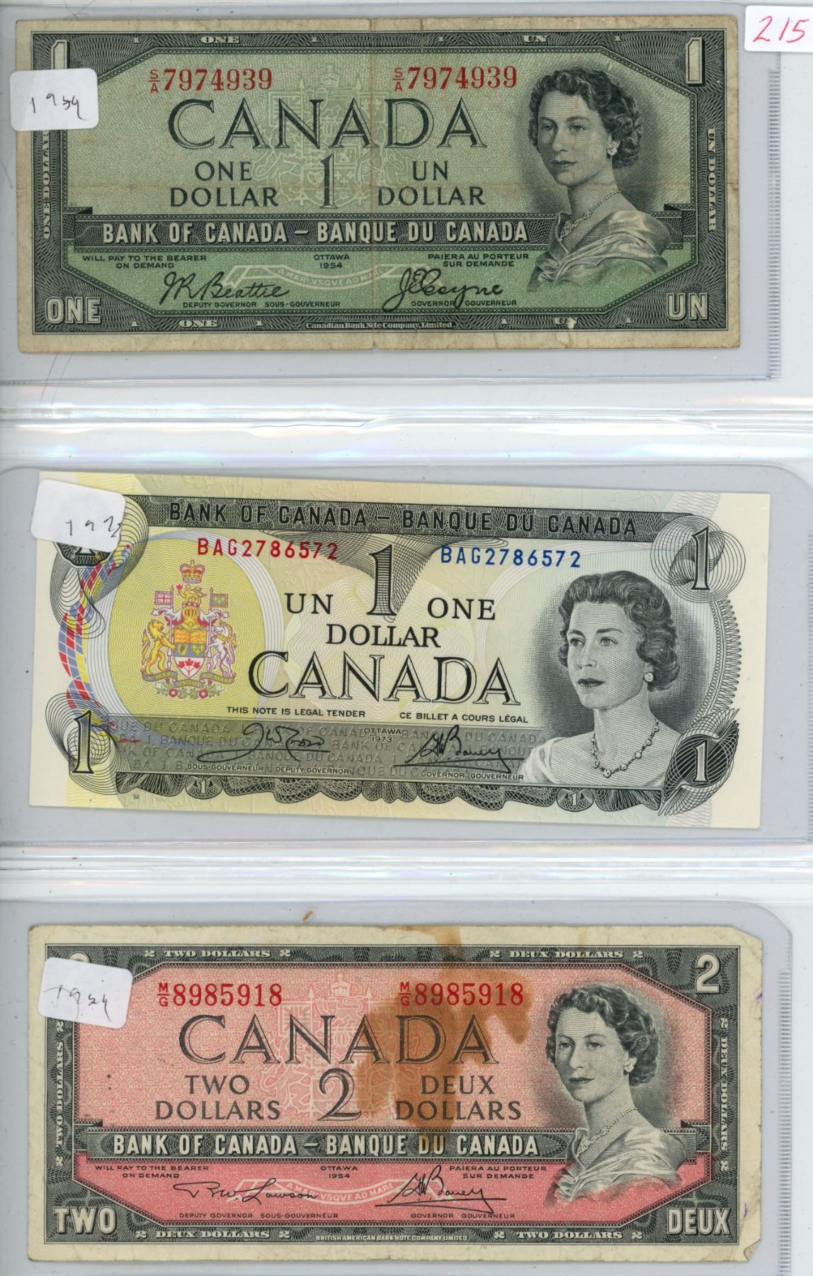 1954 Canada 1 Dollar bill, 1973 Canada 1 dollar bill, 1954 Canada 2 dollar bill