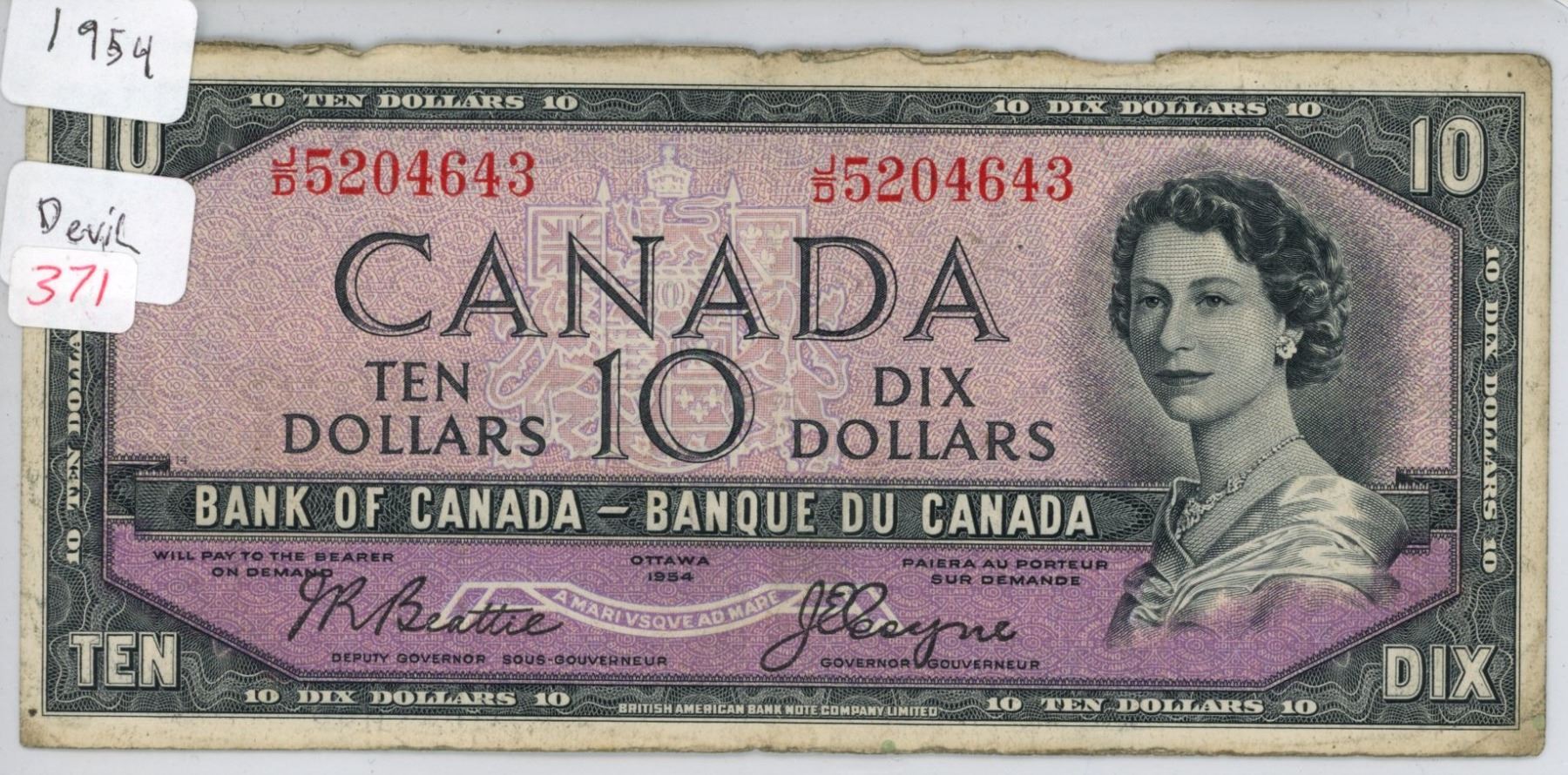 1954 Canada 10 dollar bill (Devils Face) Beattie / Coyne