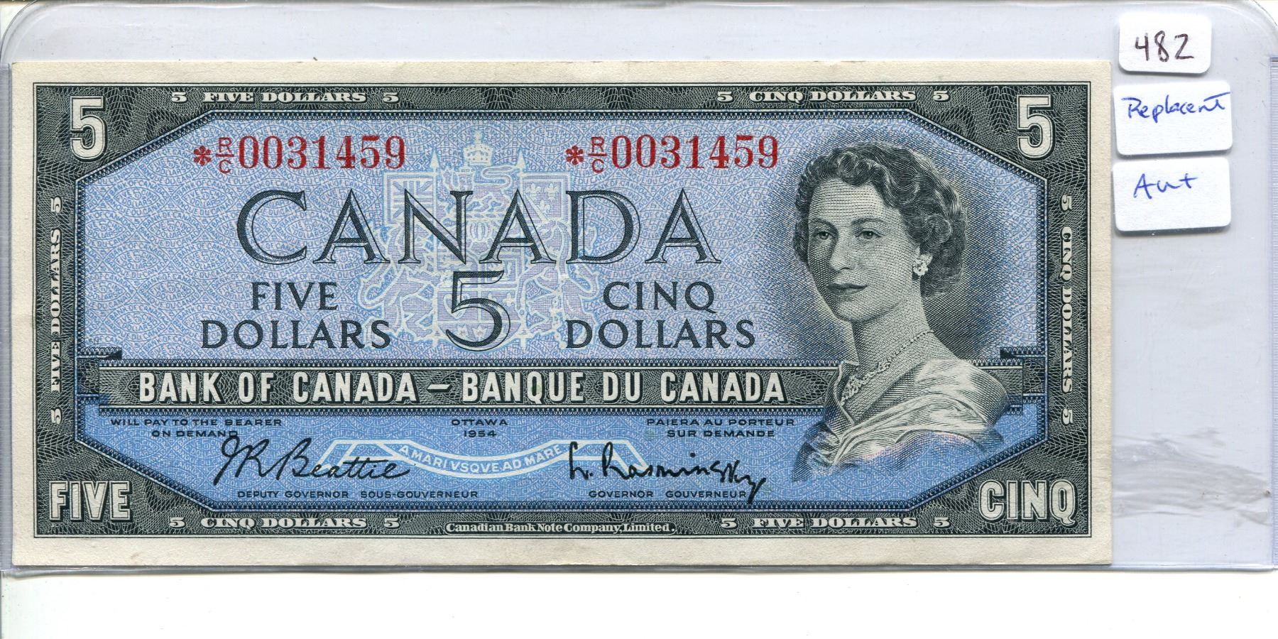 1954 Canada AU+ Replacement $5 bill, Beattie/Rasminsky, * R/C 0031459