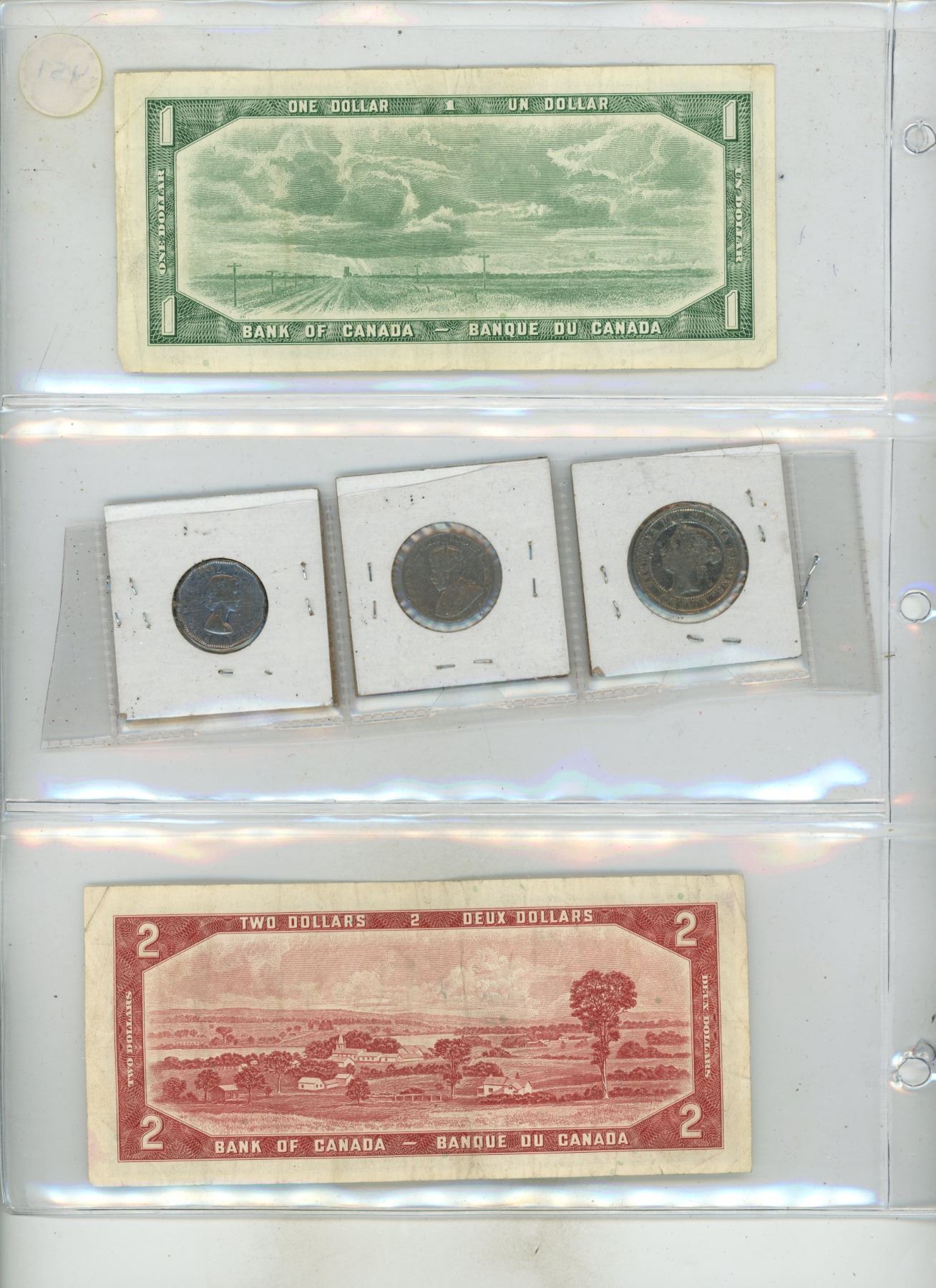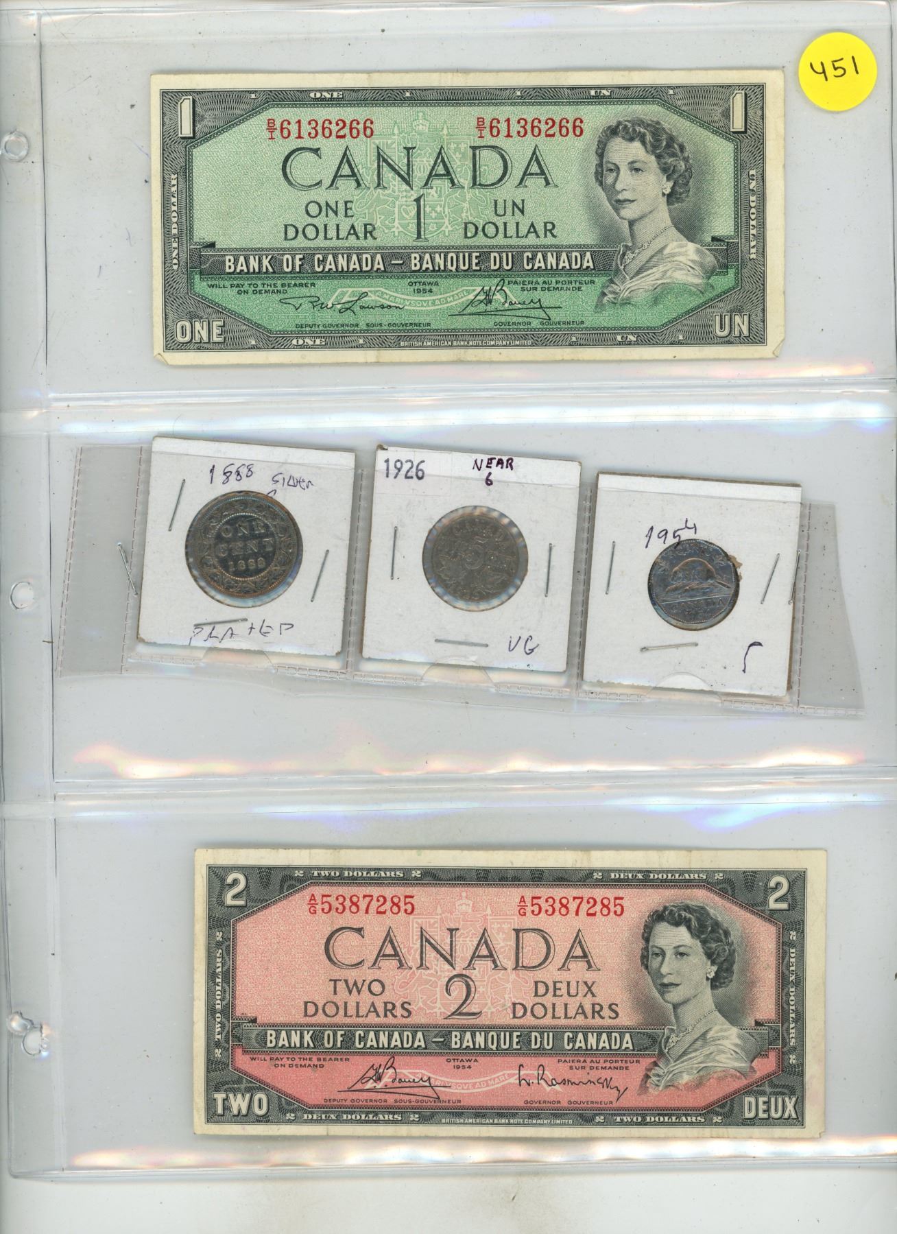 1954 Canada One, Two Dollar and 1888 Canada Large One Cent- Silver Plated, 1926 Near 6 and 1954 Canada Five Cents.