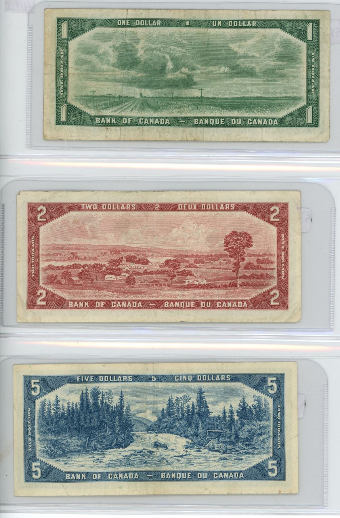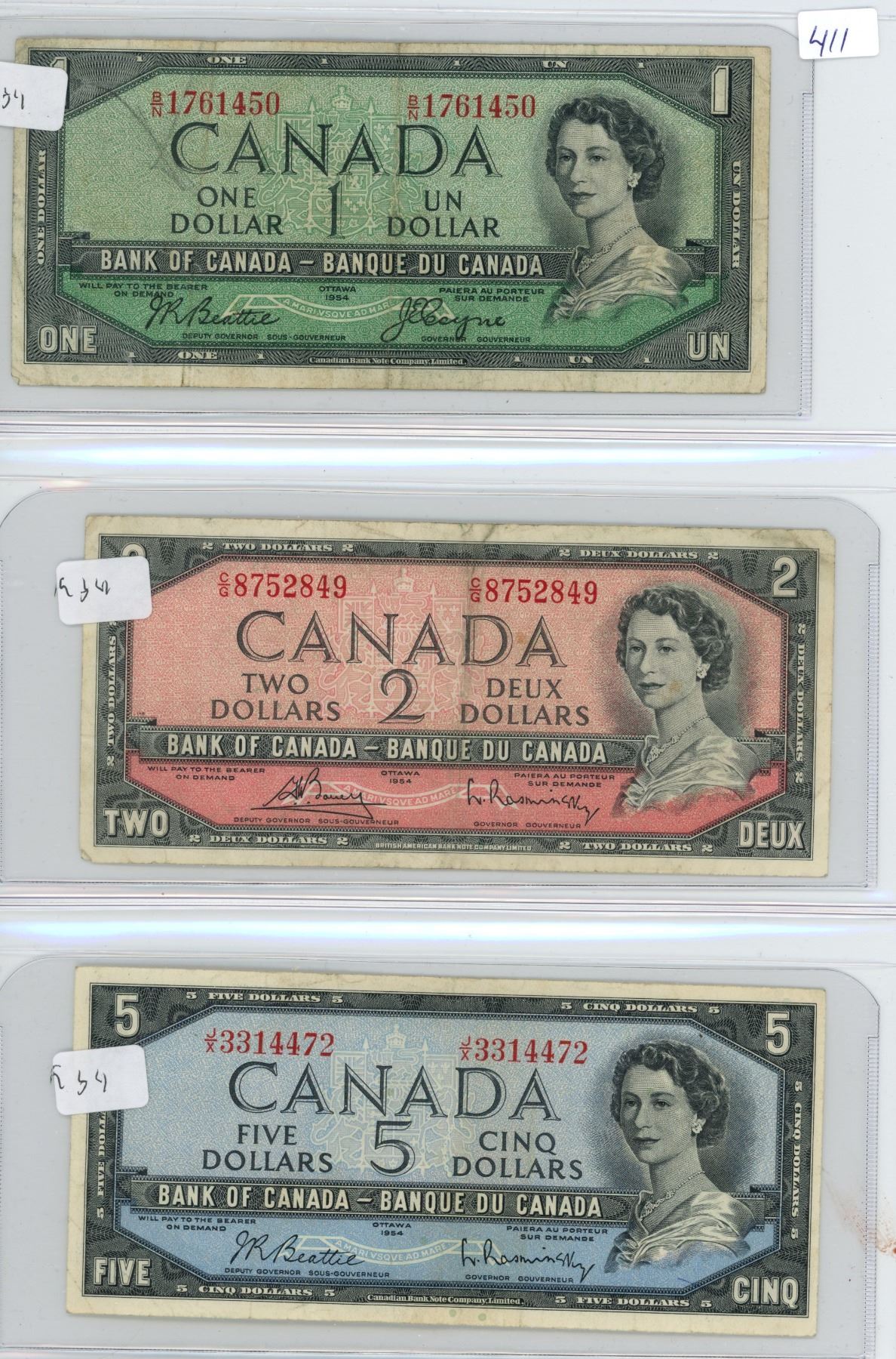 1954 Canadian 1 Dollar Bill, 1954 2 Dollar Bill and 1954 5 Dollar Bill - 3 Bills