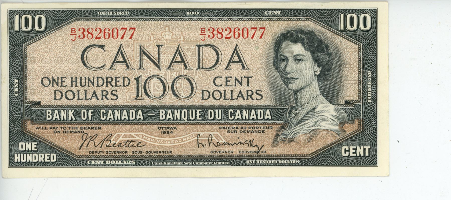 1954 Canadian 100 dollar bill - Beattie/Rasminsky - B/J 3826077