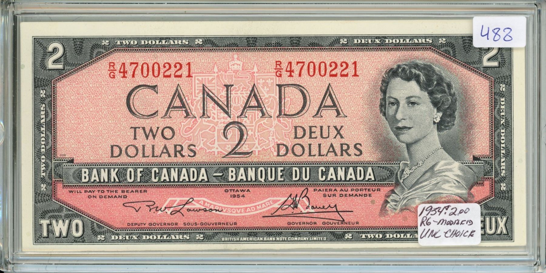 1954 Canadian 2 Dollar Bill, Lawson/Bouey, R/G4700221, RG Modified, Choice-UNC