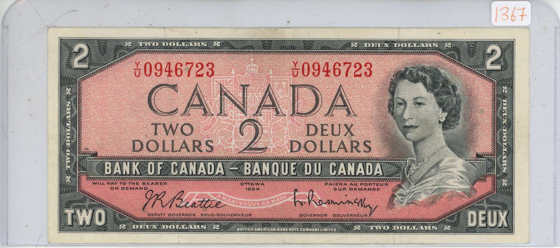 1954 Canadian 2 dollar bill - Beattie/Rasminsky - Y/U 0946723