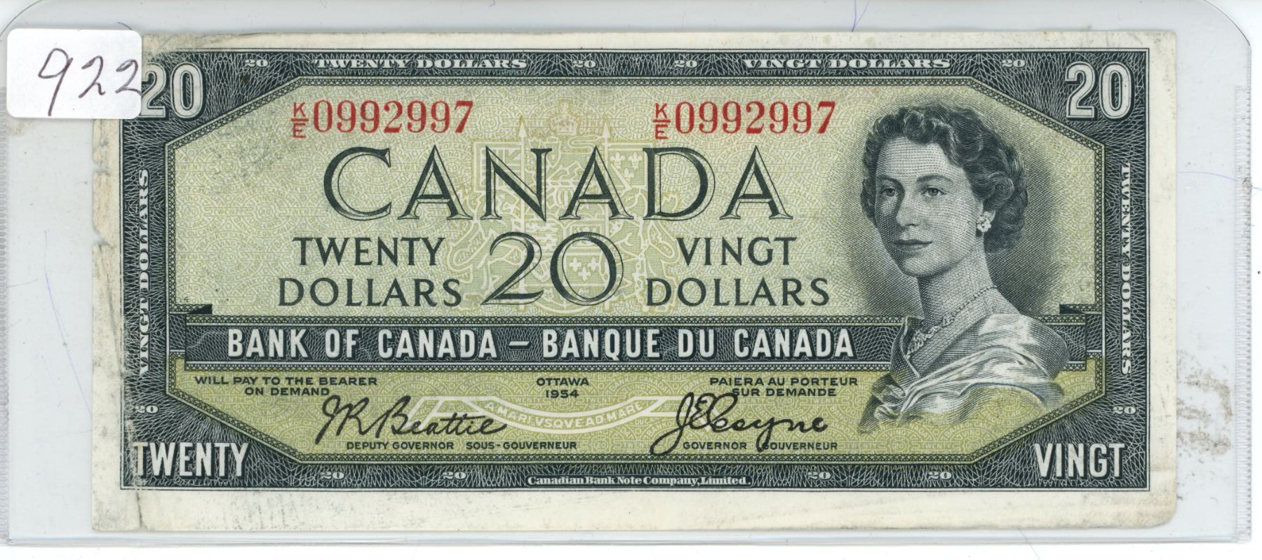 1954 Canadian 20 dollar bill - Beattie/Coyne - K/E 0992997