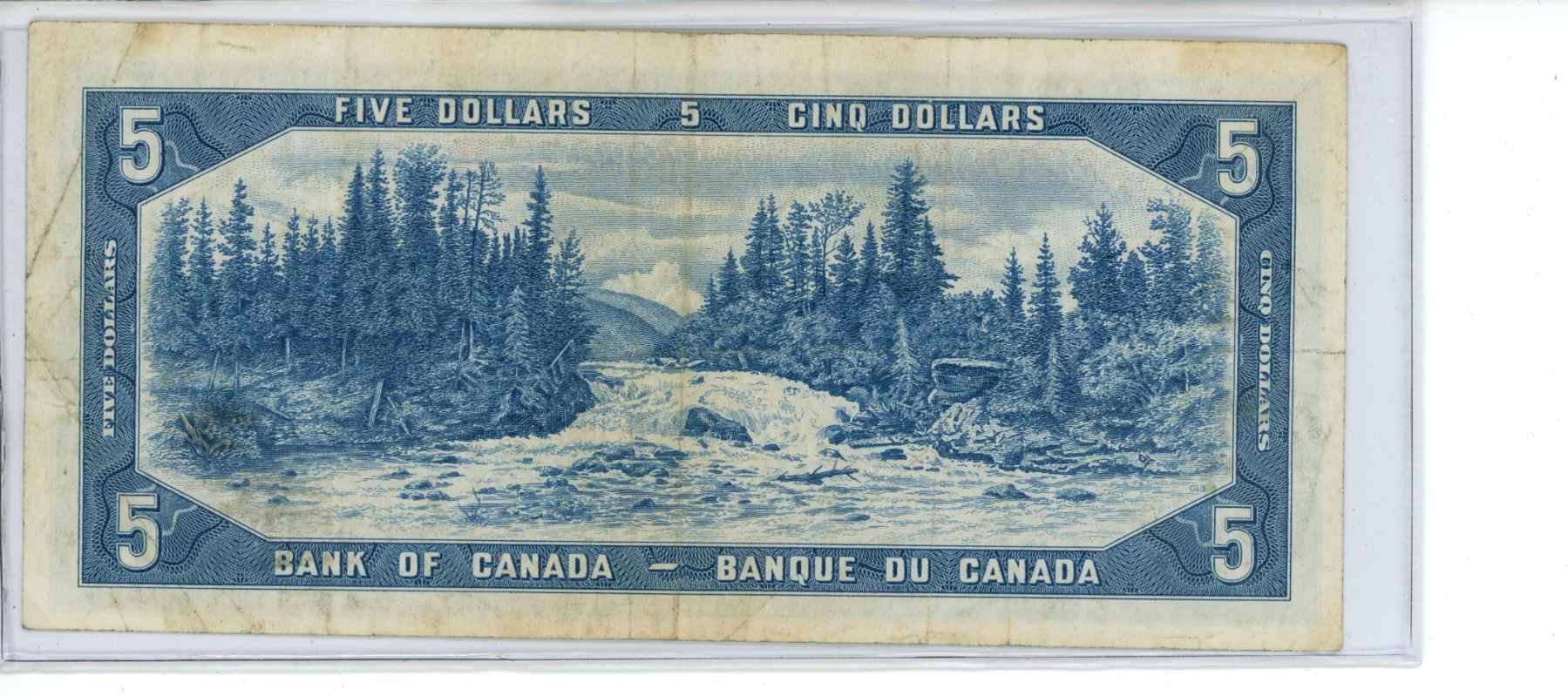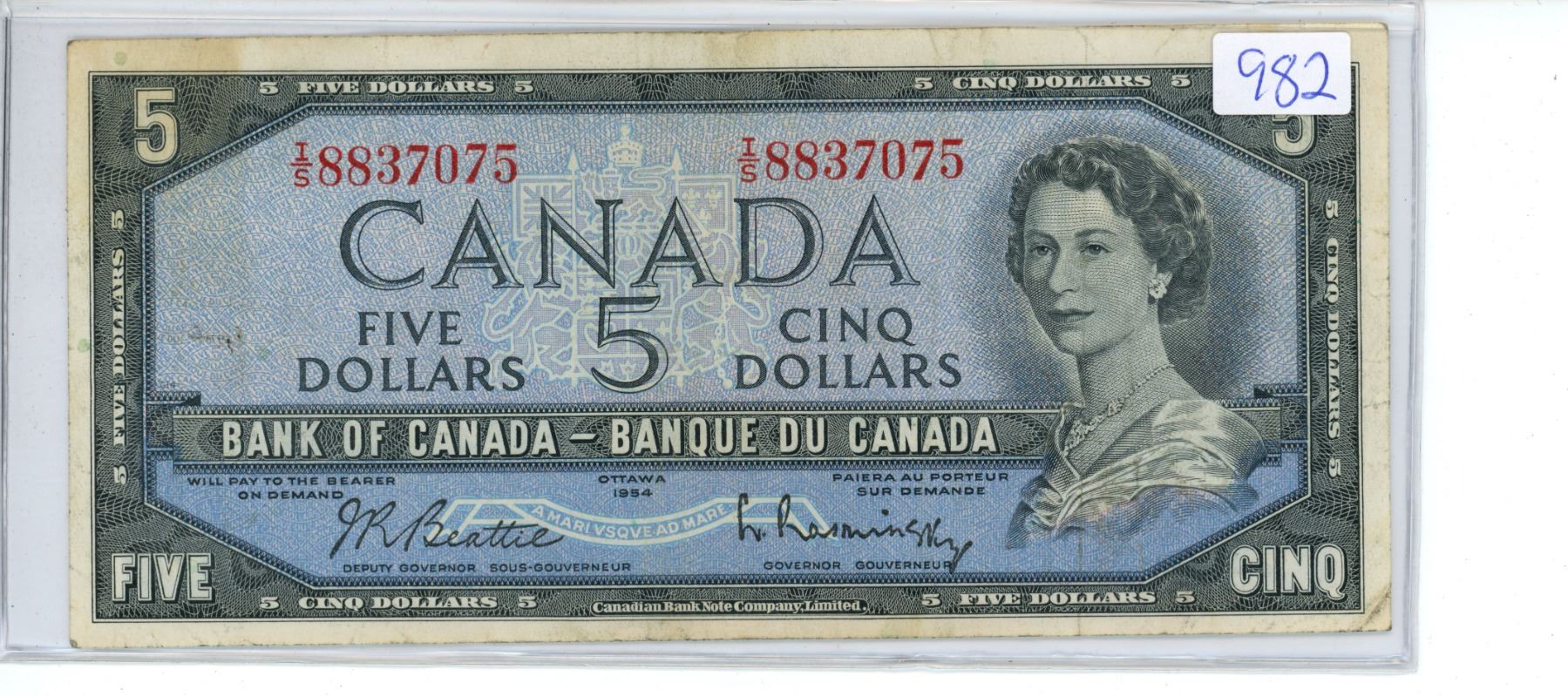 1954 Canadian $5 bill - Beattie/Rasminsky - I/S prefix - 8837075