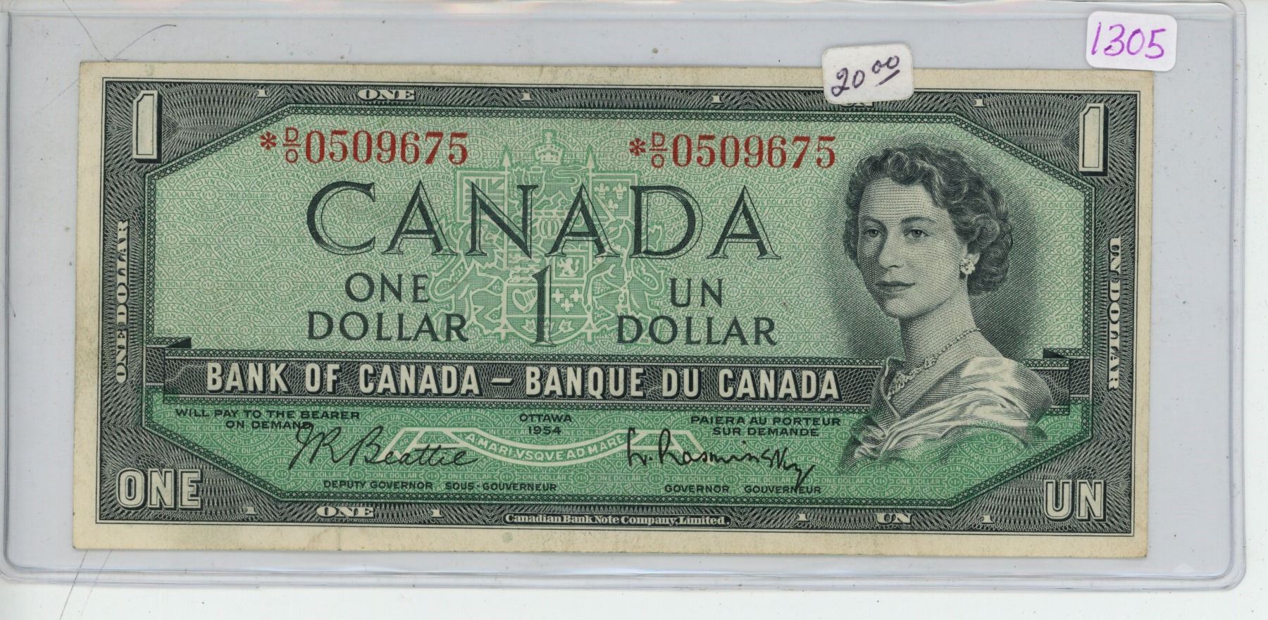 1954 Canadian replacement 1 dollar bill - Beattie/Rasminsky - *D/O 0509675
