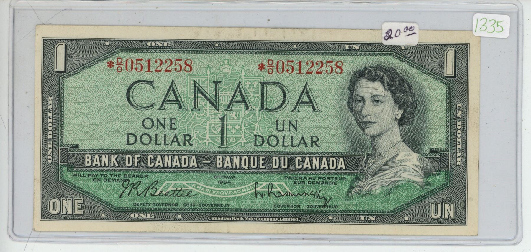1954 Canadian replacement 1 dollar bill - Beattie/Rasminsky - *D/O 0512258