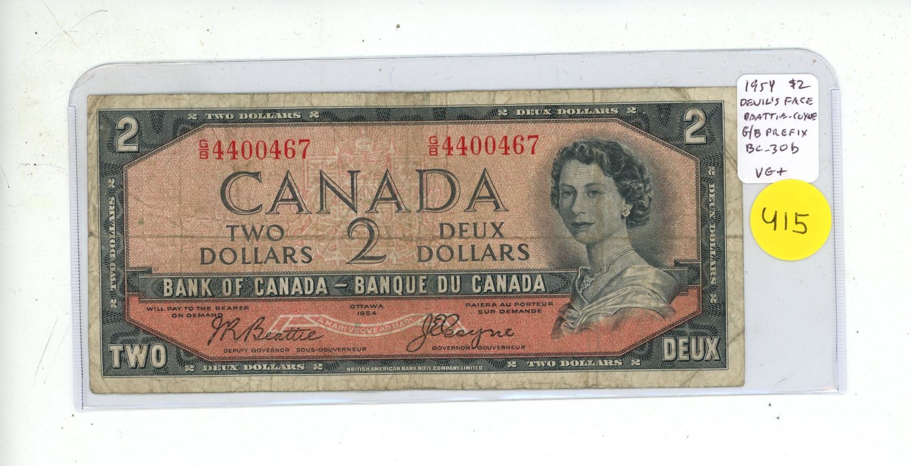 1954 Devil’s Face $2 note. Beattie-Coyne signatures. G/B Prefix. BC-30b. VG10.