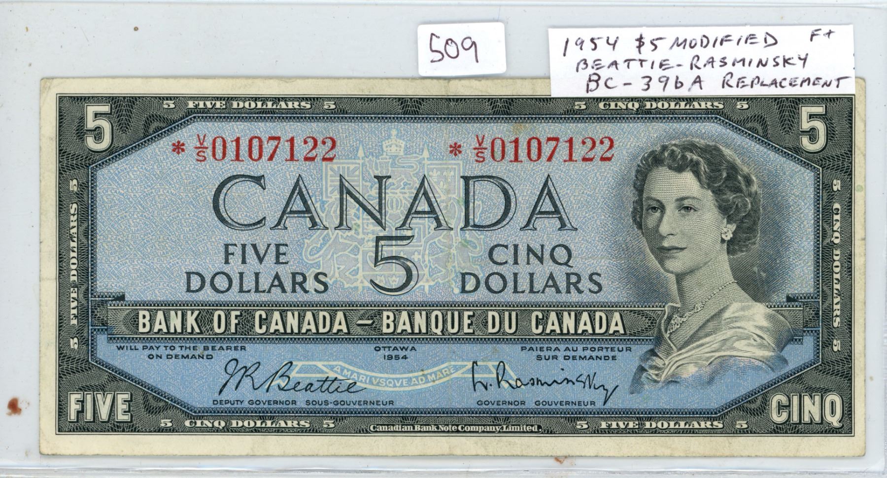 1954 Modified Portrait $5 Replacement note. Beattie-Rasminsky signatures. *V/S Prefix. BC-39bA. F+.