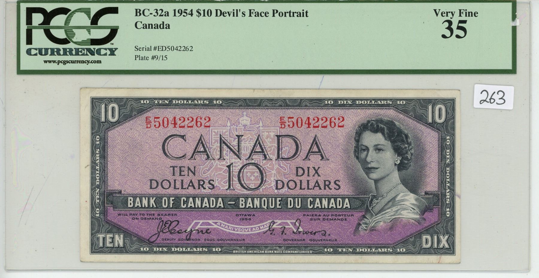 1954 PCGS graded, Canadian 10 dollar "Devil's Face" bill - Coyne/Towers - E/D 5042262 - VF35