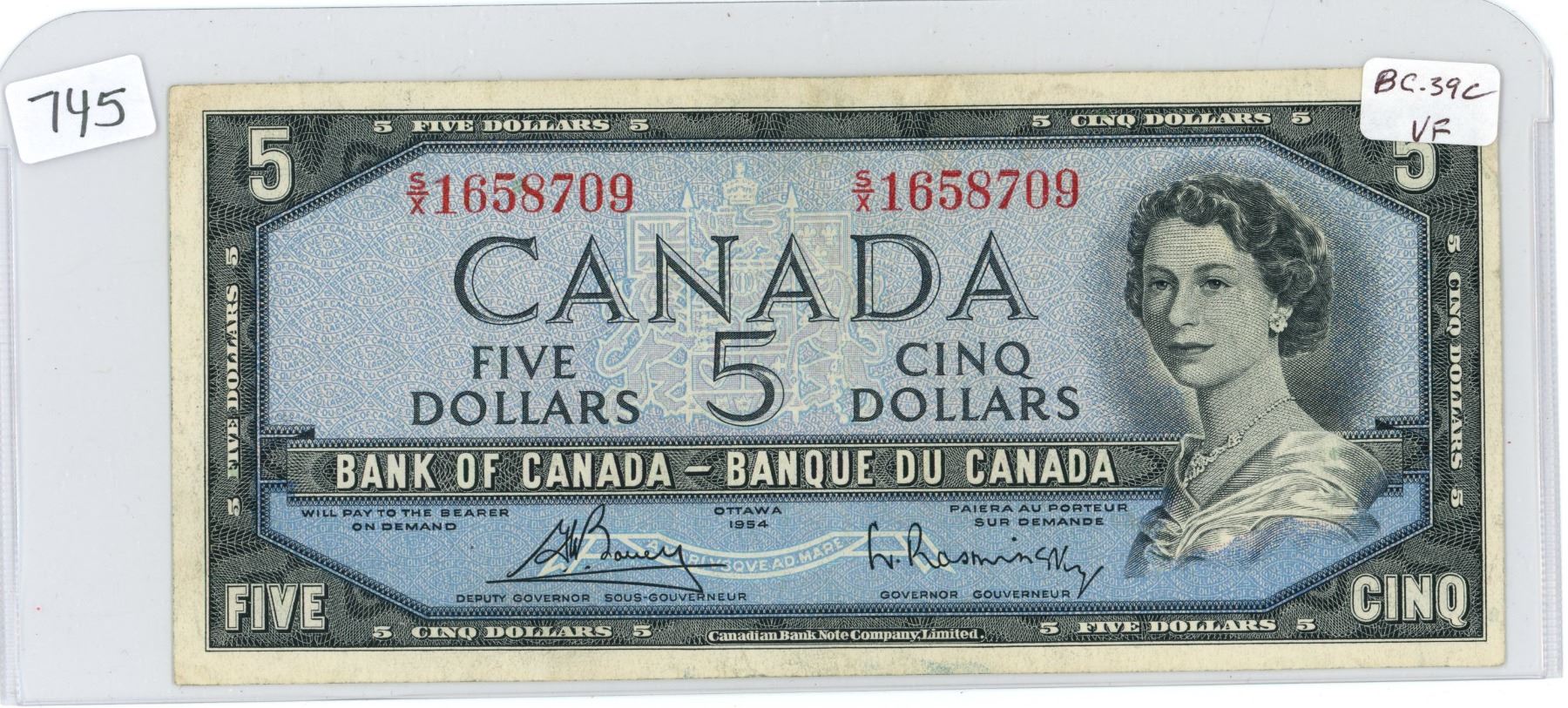 1954 canada $5 bill, Bouey/ Rasminsky ( #S/X 1658709)