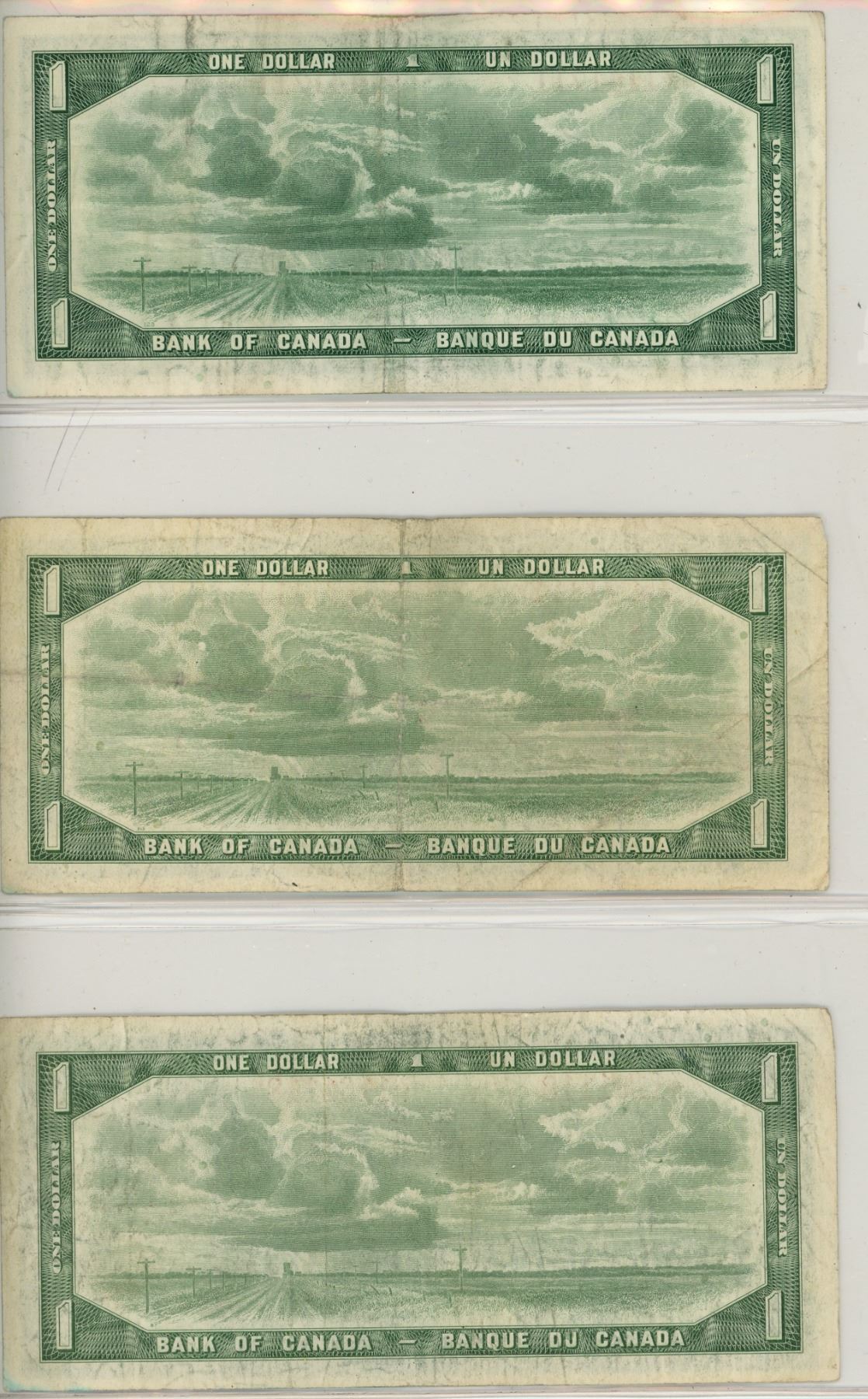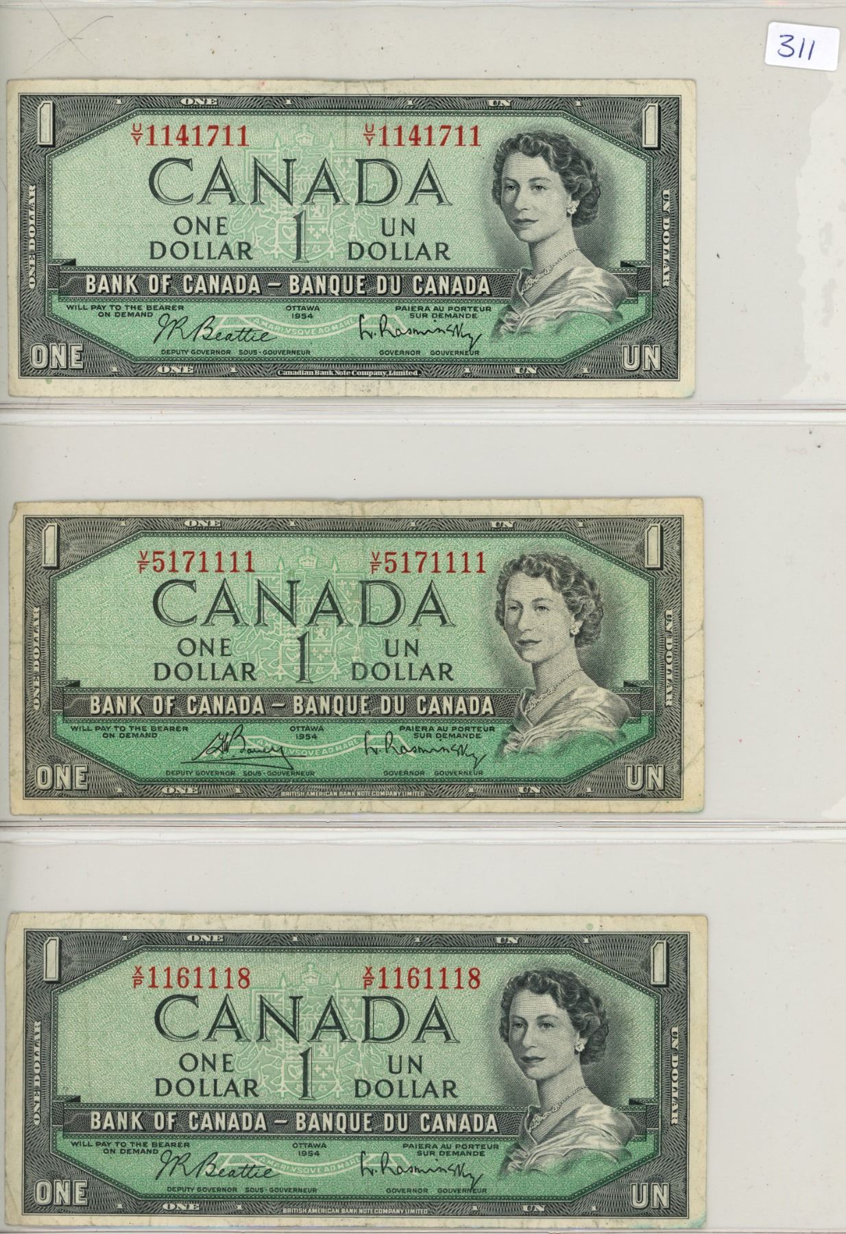 1954 (x3) Canada $1 bills: Beattie/Rasminsky # 1141711, Bouey/Rasminsky