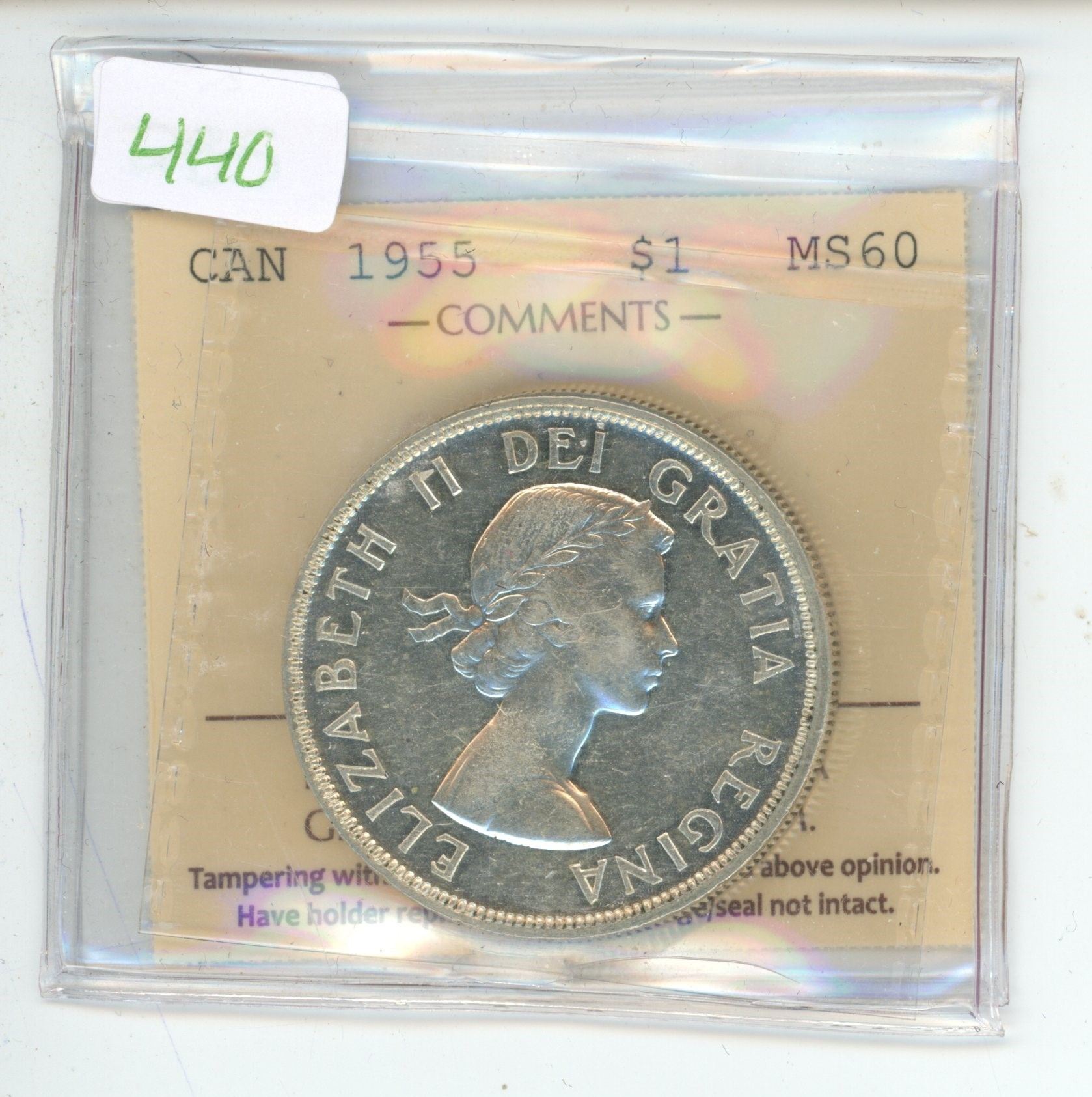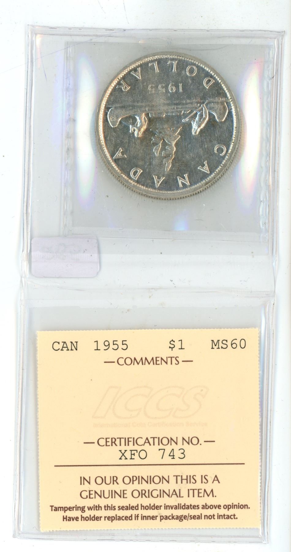 1955 ICCS Graded, Canadian silver voyageur dollar - MS60